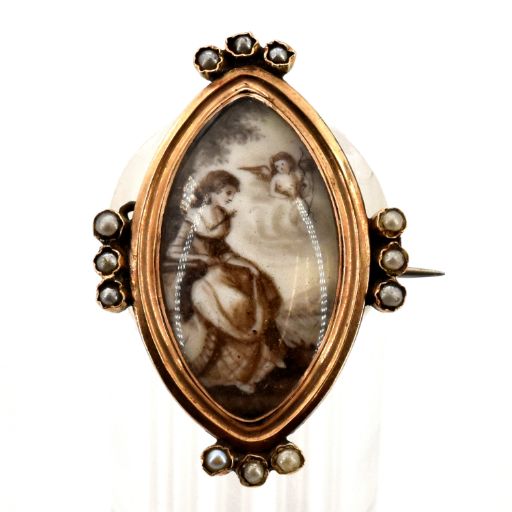 Borstspeld in 18 kt geelgoud met speld in metaal bezet met parels en 1 miniatuur (glas) - 6.6 g bruto