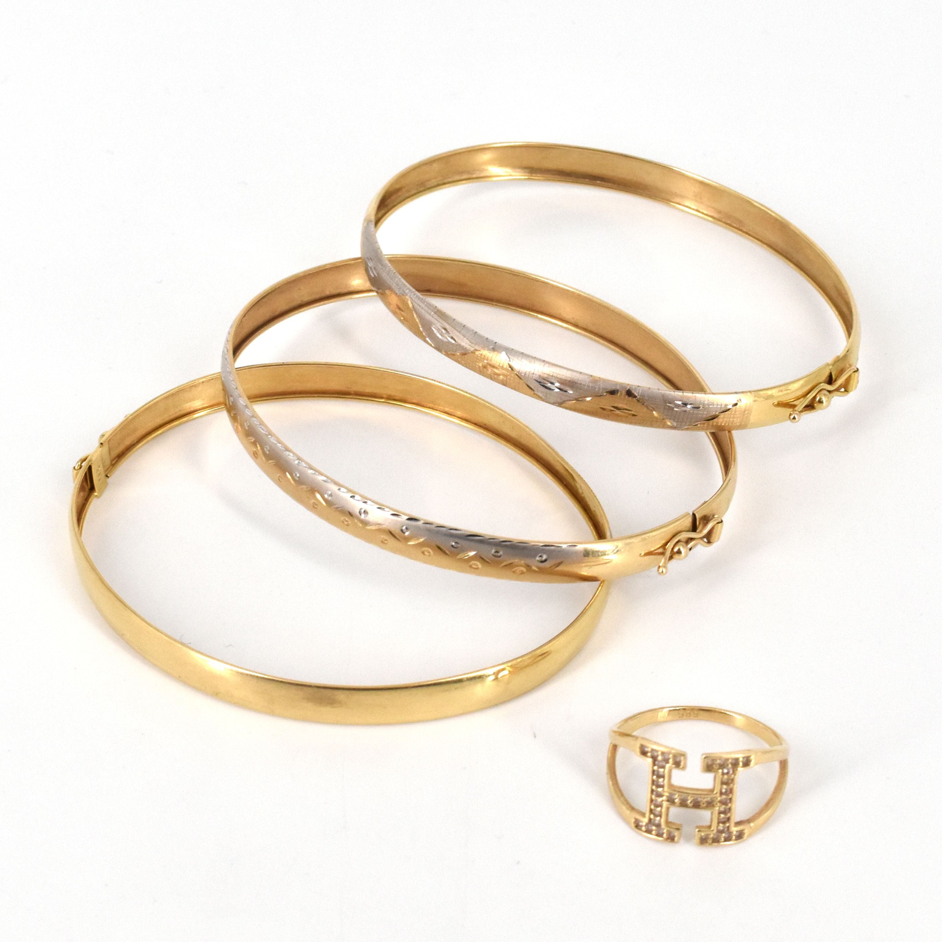 Ring en 3 onbuigzame armbanden in 14 kt geel- en witgoud (valse stenen, gepersonaliseerd) - 11.6 g bruto (Maat: 56) (6 x 5 cm x 3)