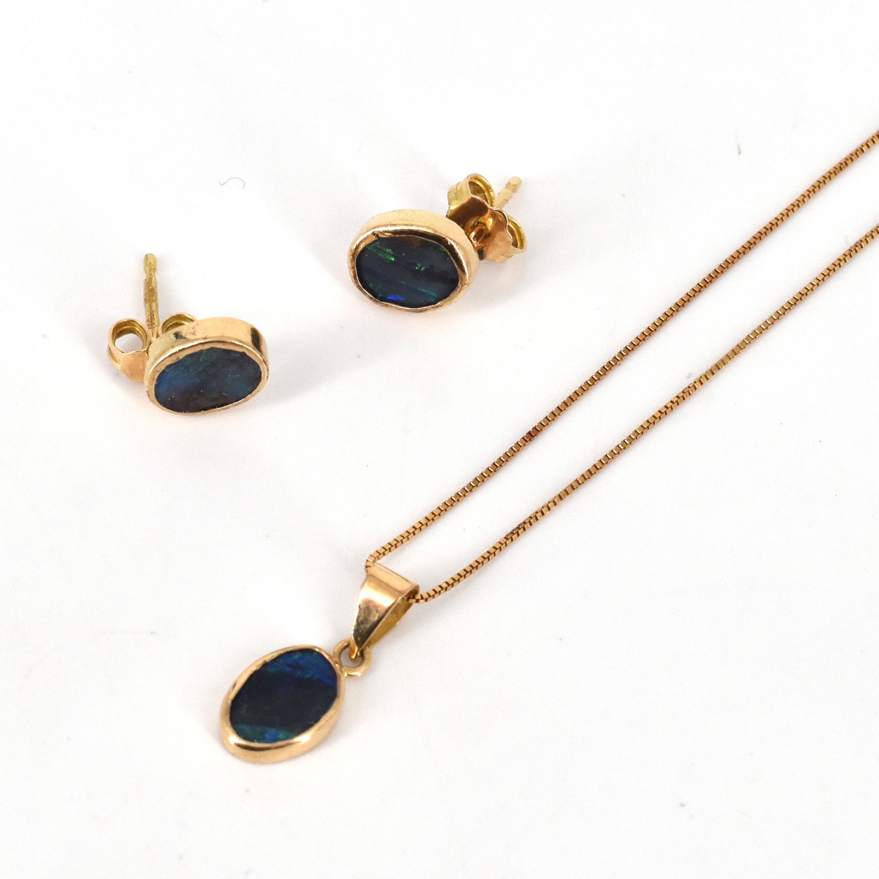 Halsketting, hanger en 2 oorringen in 18 kt geelgoud bezet met 3 opalen (beschadigd) - 4 g bruto (50 cm)