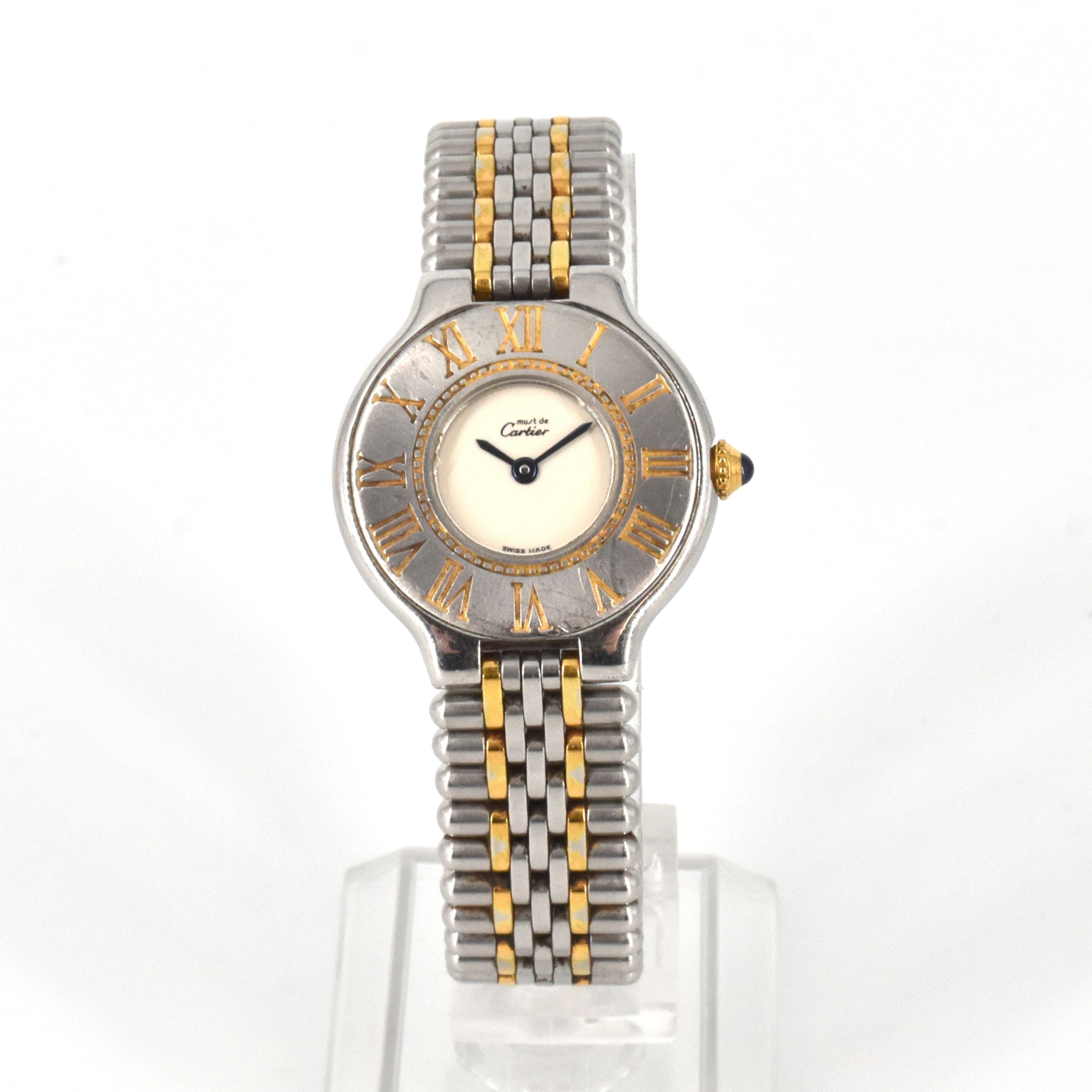 Damespolshorloge in staal en pleetgoud CARTIER Must 21 quartz (kleursteen in de opwinder, horloge nr 910455, gekrast, gebroken glas, pleetgoud beschadigd)