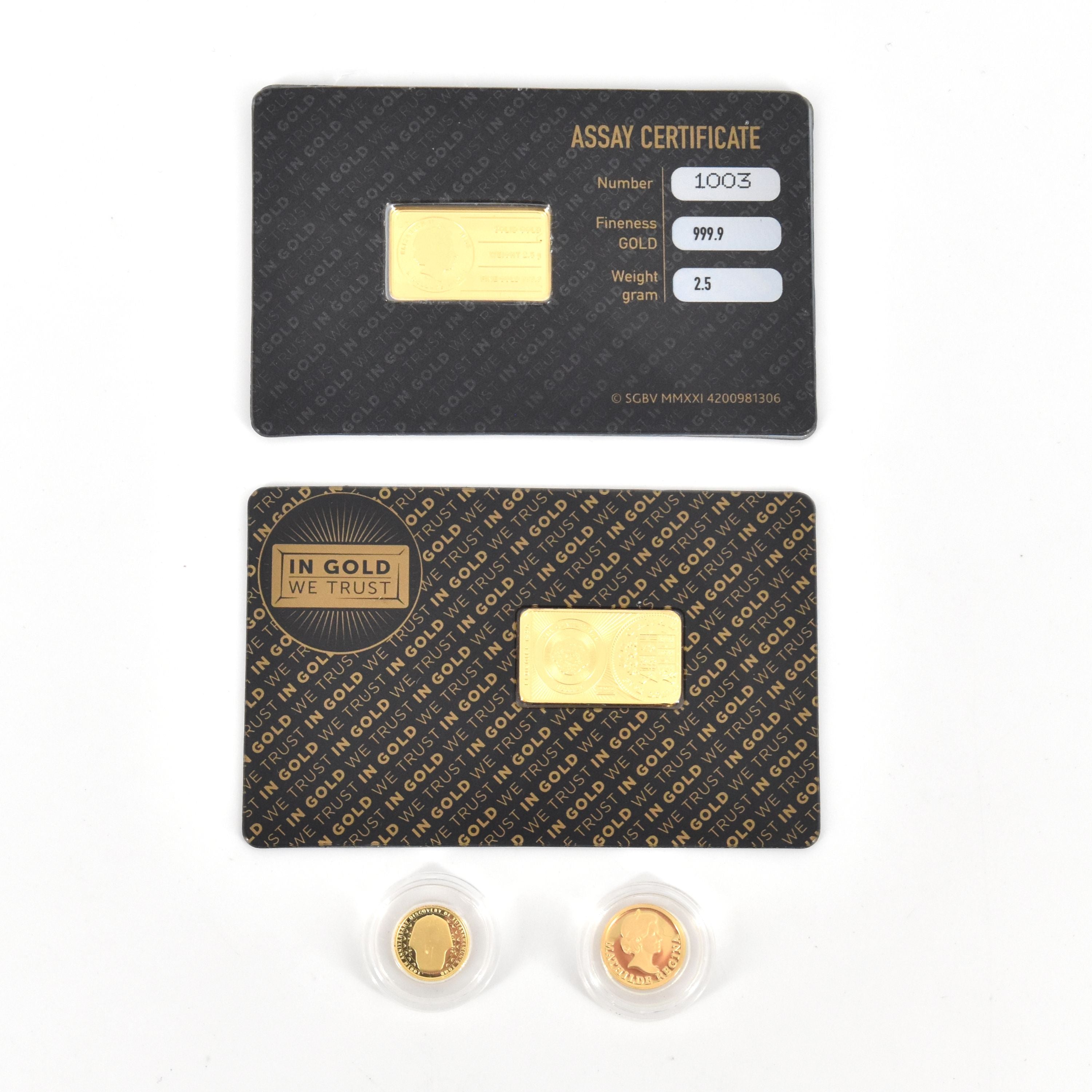 Muntstuk in geelgoud 585/1000 munt ter ere van de belgische monarchie (belgische - Koningin Mathilde) - 0.7 g + certificaat muntstuk in geelgoud 999.9/1000 (Gibraltar-Elisabeth II - de ontdekking van het graf van Toetanchamon - 1/25 kroon-2022) - 0.5 g + certificaat goudstraaf in geelgoud 999.9/1000 (australisch-Elisabeth II-5 dollar-2021) - 2.5 g goudstraaf in geelgoud 999.9/1000 (canadees-Elisabeth II-5 dollar-2021) - 2.5 g