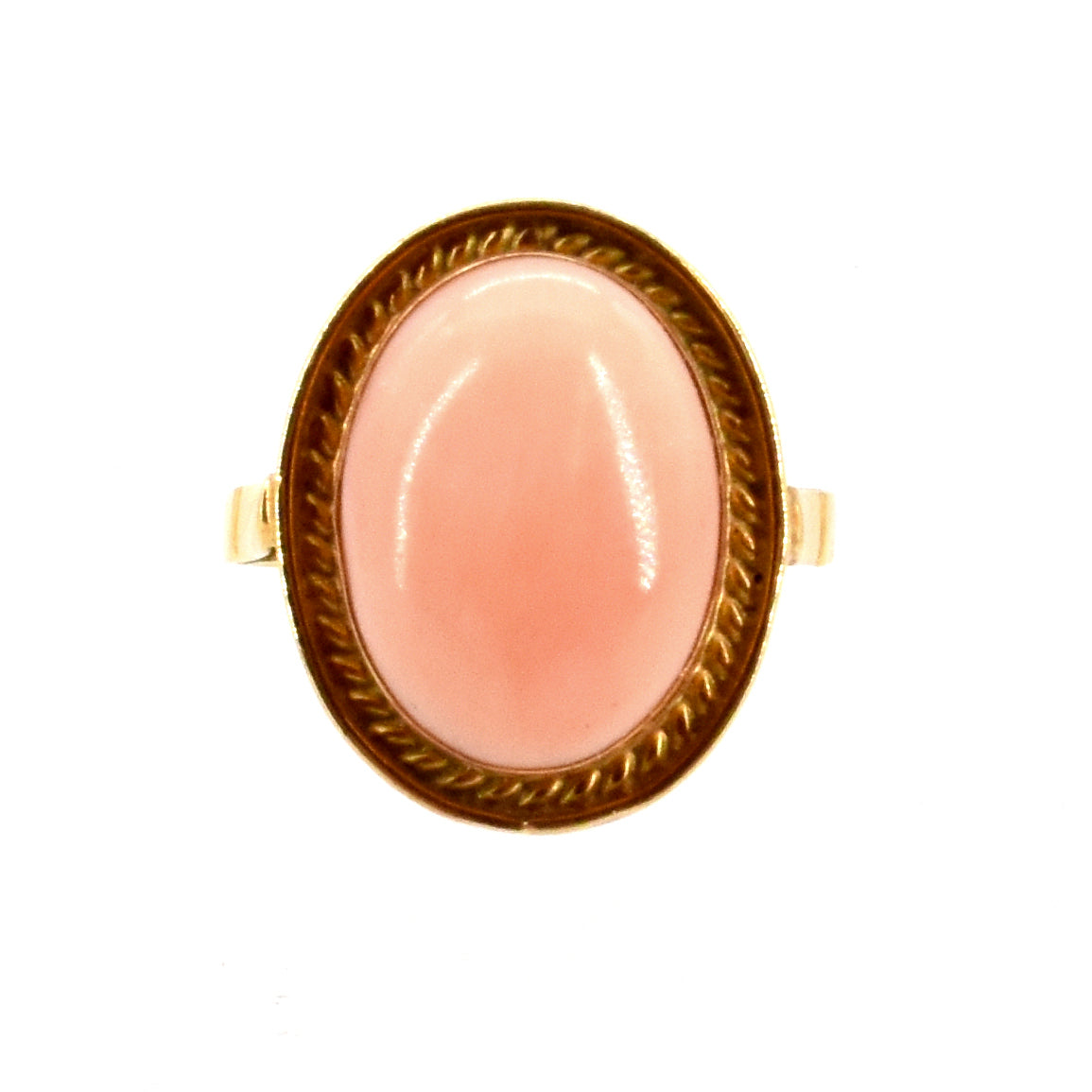 Ring in 18 kt geelgoud bezet met 1 koraal (licht gedeukt) - 5.6 g brut (Maat: 55)