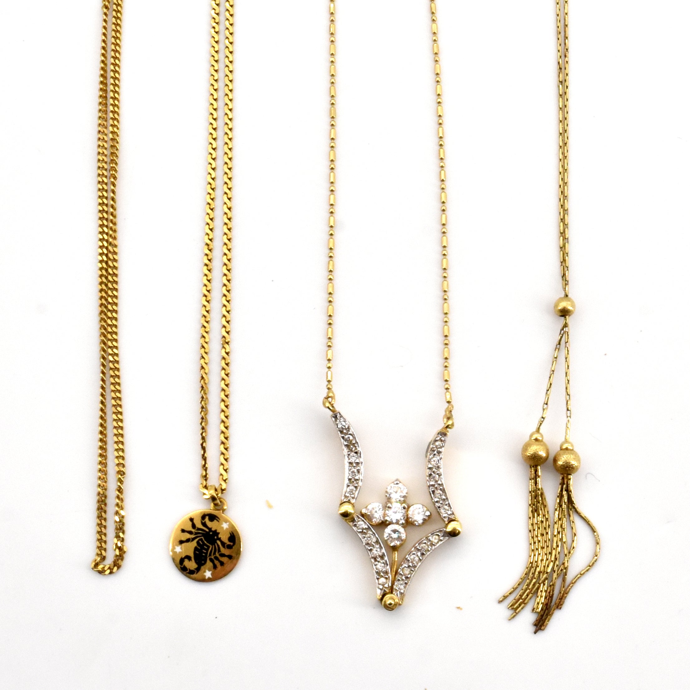 2 halskettingen en hanger in 18 kt geelgoud (email) - 17.1 g (59.5 & 56 cm) 2 halskettingen in 14 kt geelgoud (valse stenen) - 15.3 g bruto (50 & 47.5 cm)