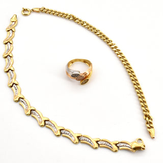 Ring in 18 kt 3-kleurengoud (valse stenen, gedeukt) - 4.1 g brut o (Maat: 52) 2 armbanden in 14 kt geel- en witgoud (beschadigd, gedeukt) - 12.1 g (19 & 17.5 cm)