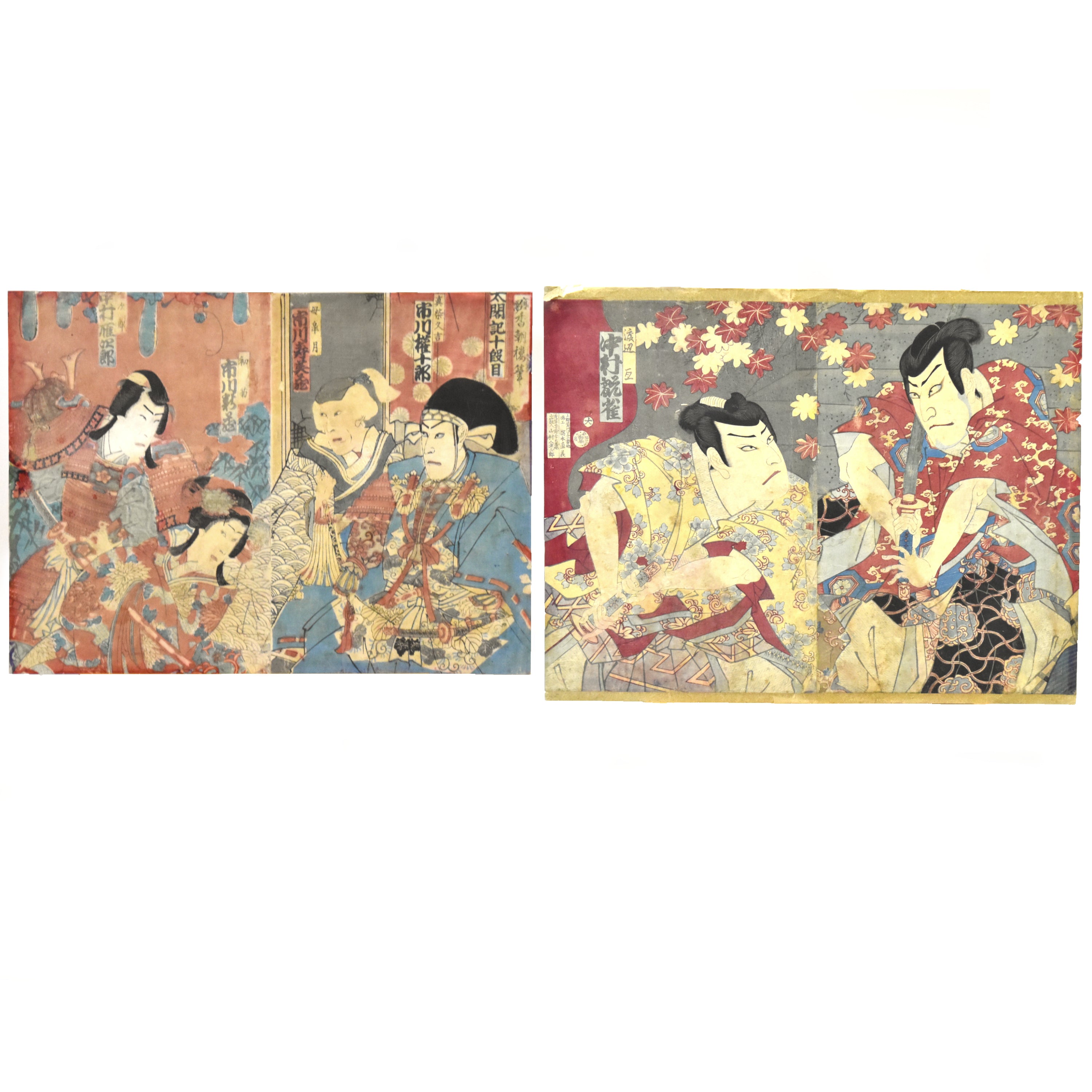 2 Japanse afdrukken toegekend aan Kunisada UTAGAWA: "Acteurs Kabuki" (gescheurd, sterk beschadigd en bevlekt) (48 x 37 cm & 46.5 x 34 cm)