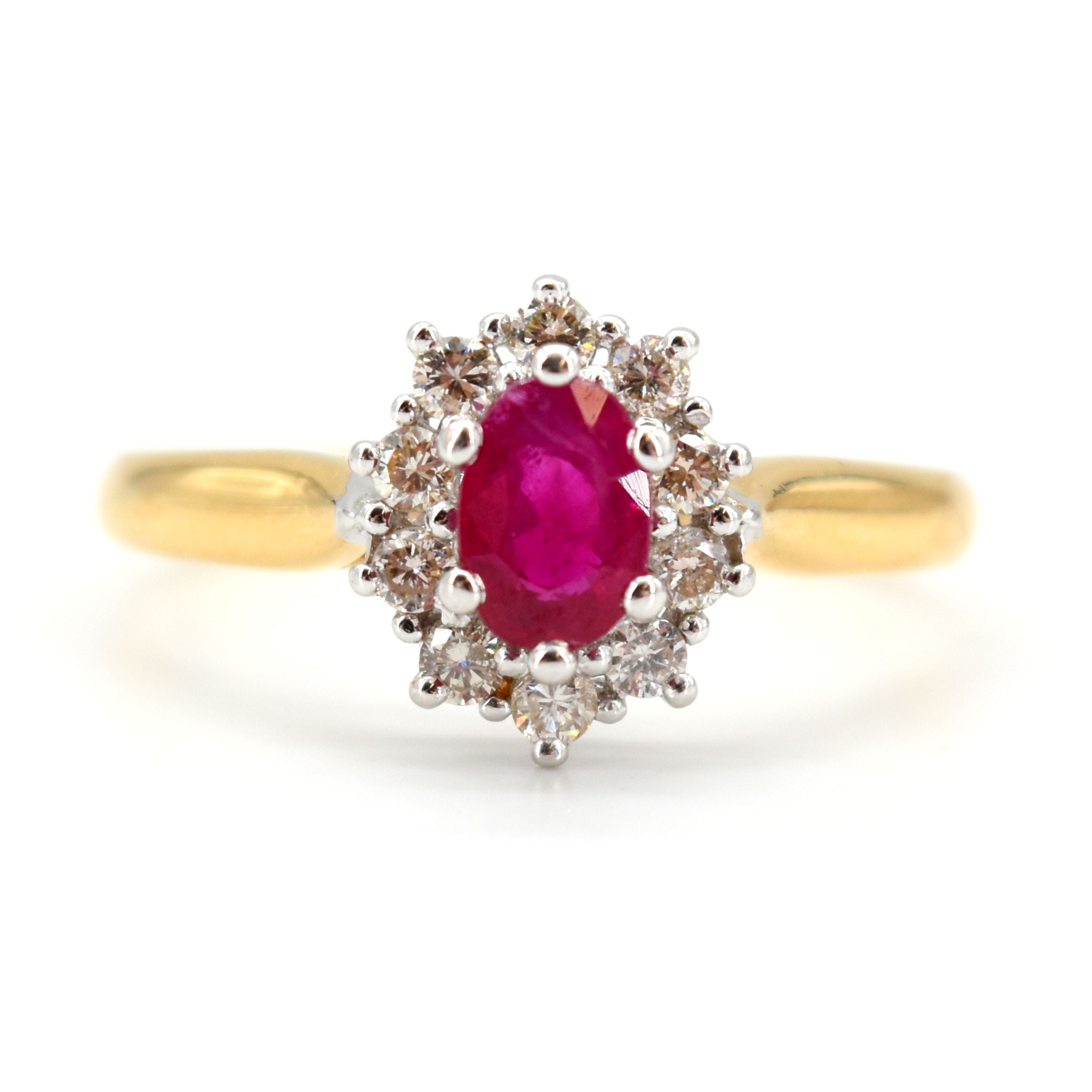 Ring in 18 kt geel- en witgoud bezet met 10 briljanten +/- 0.30 kt en 1 robijn - 3.3 g (Maat: 57)