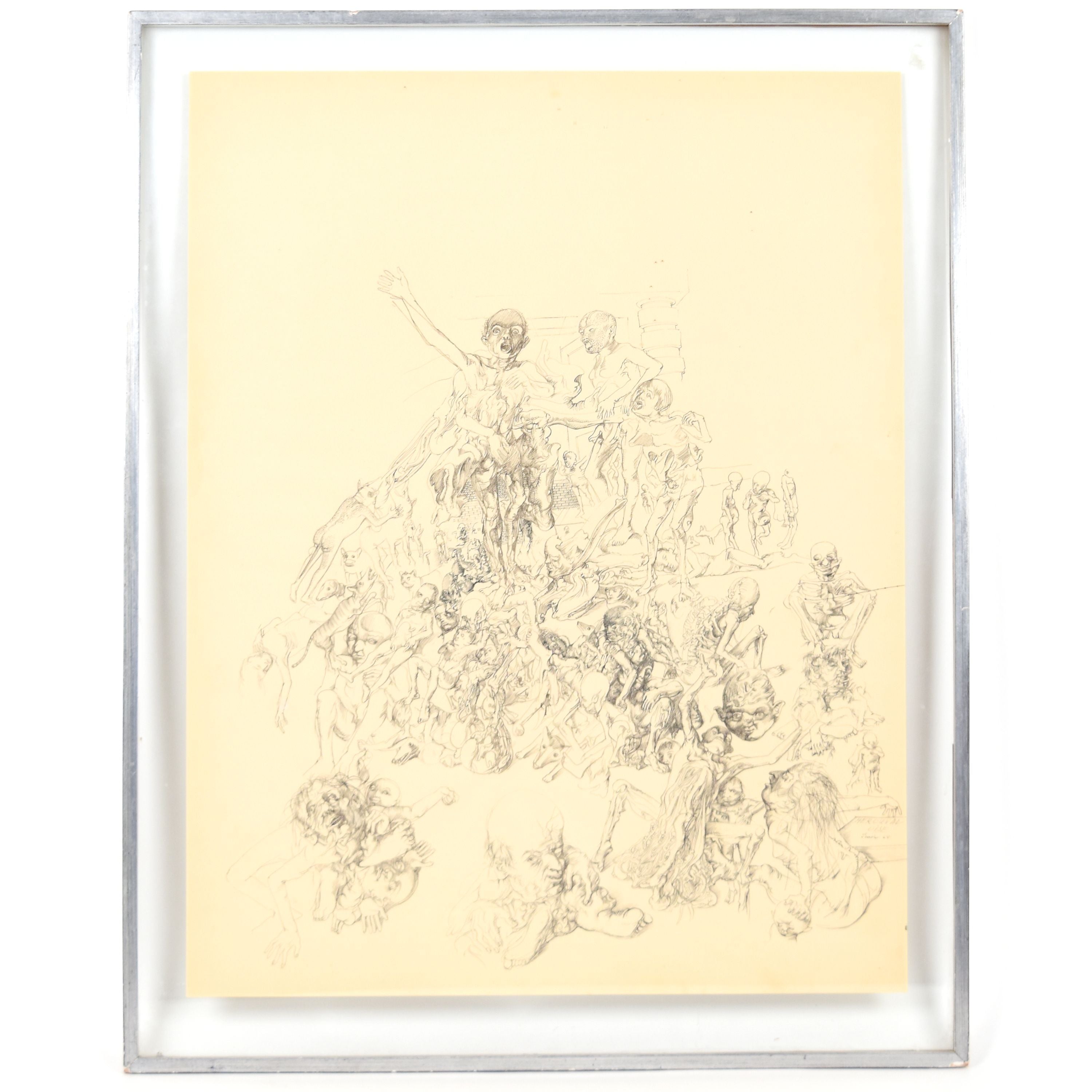 Potloodtekening op papier getekend DADO: "Herouvaloise" (kader beschadigd) (49.5 x 64 cm)