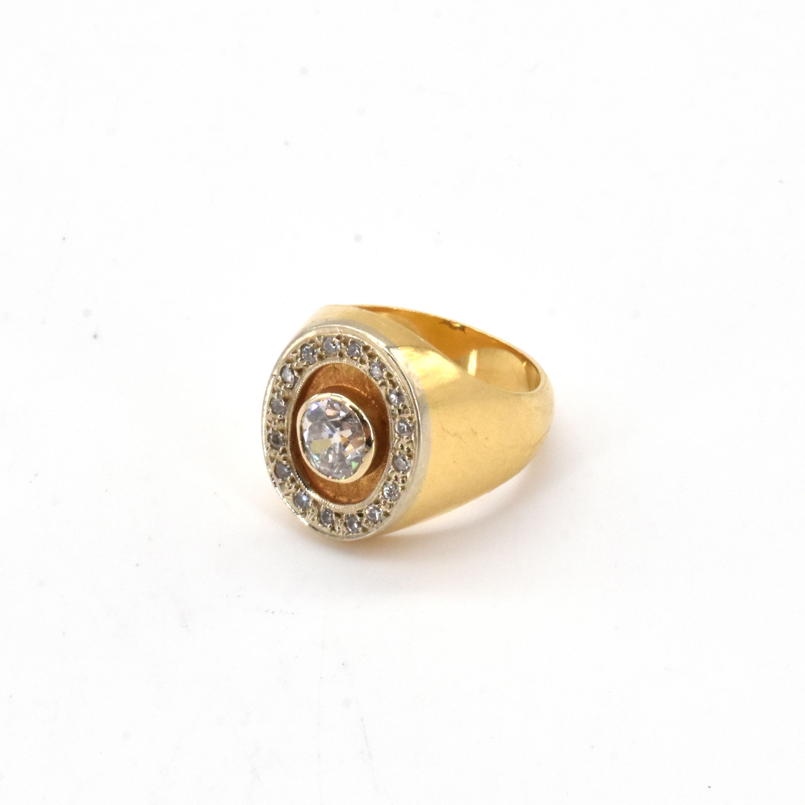Ring in 18 kt geel- en witgoud, bezet met 1 briljant oud slijpsel +/- 0.65 kt en 16 diamanten 8/8 slijpsel +/- 0.20 kt - 13.8 g (Maat: 49)