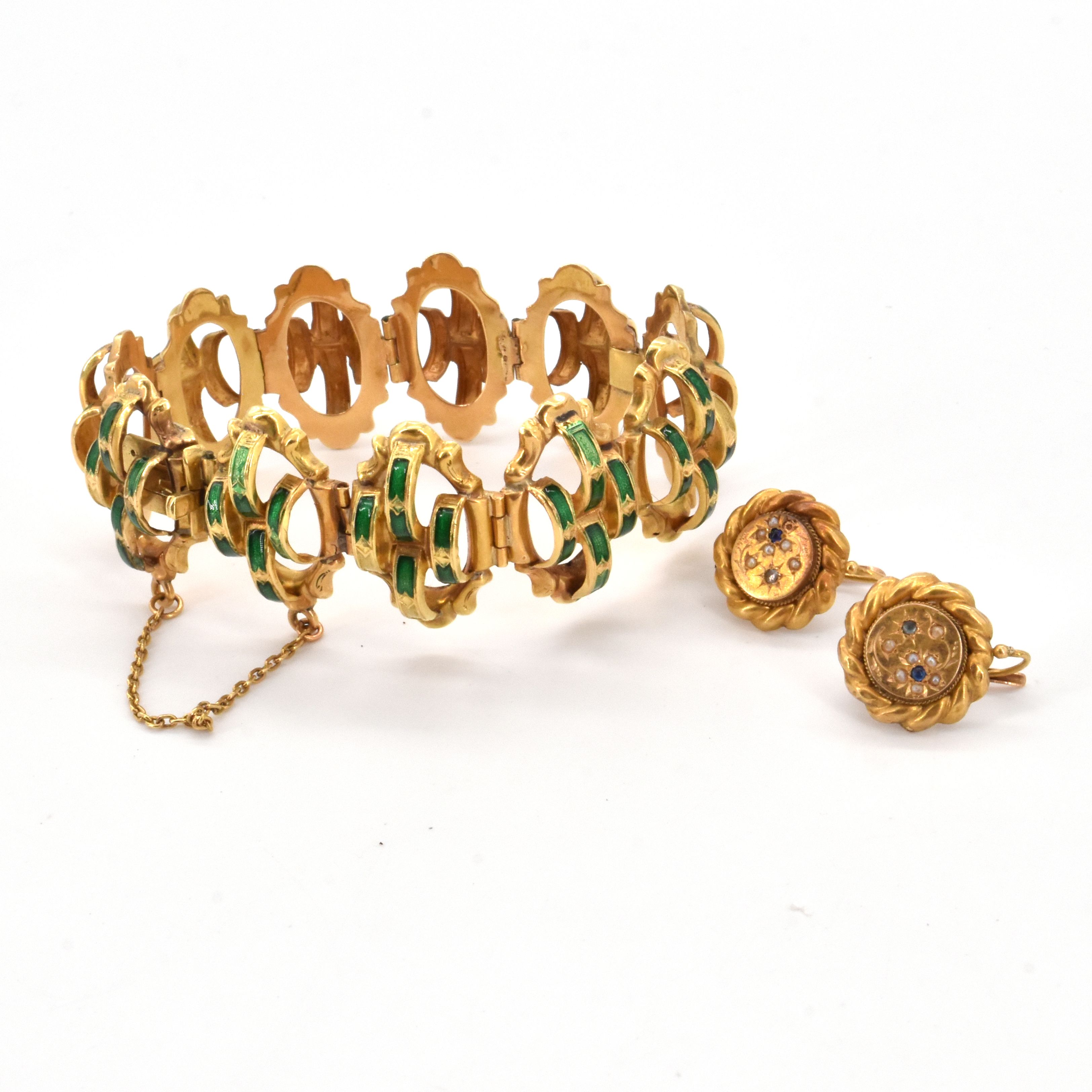 Armband en 2 oorringen in 18 kt geelgoud (kleurstenen, parels, veiligheidsketting, parel ontbreekt, parels beschadigd, email, email beschadigd, gedeukt) - 19.2 g (17 cm)