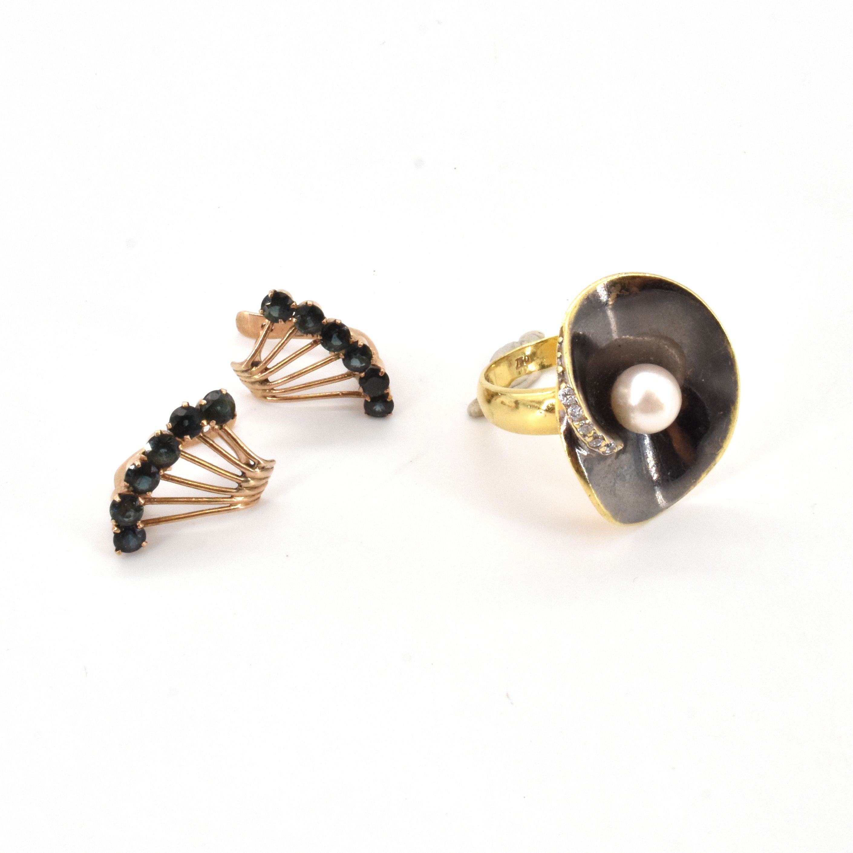 Ring in 18 kt geelgoud (valse stenen, parel, gerodiëerd, beschadigd) - 10.5 g bruto (Maat: 57) 2 oorringen in 14 kt roségoud (kleurstenen) - 3 g bruto