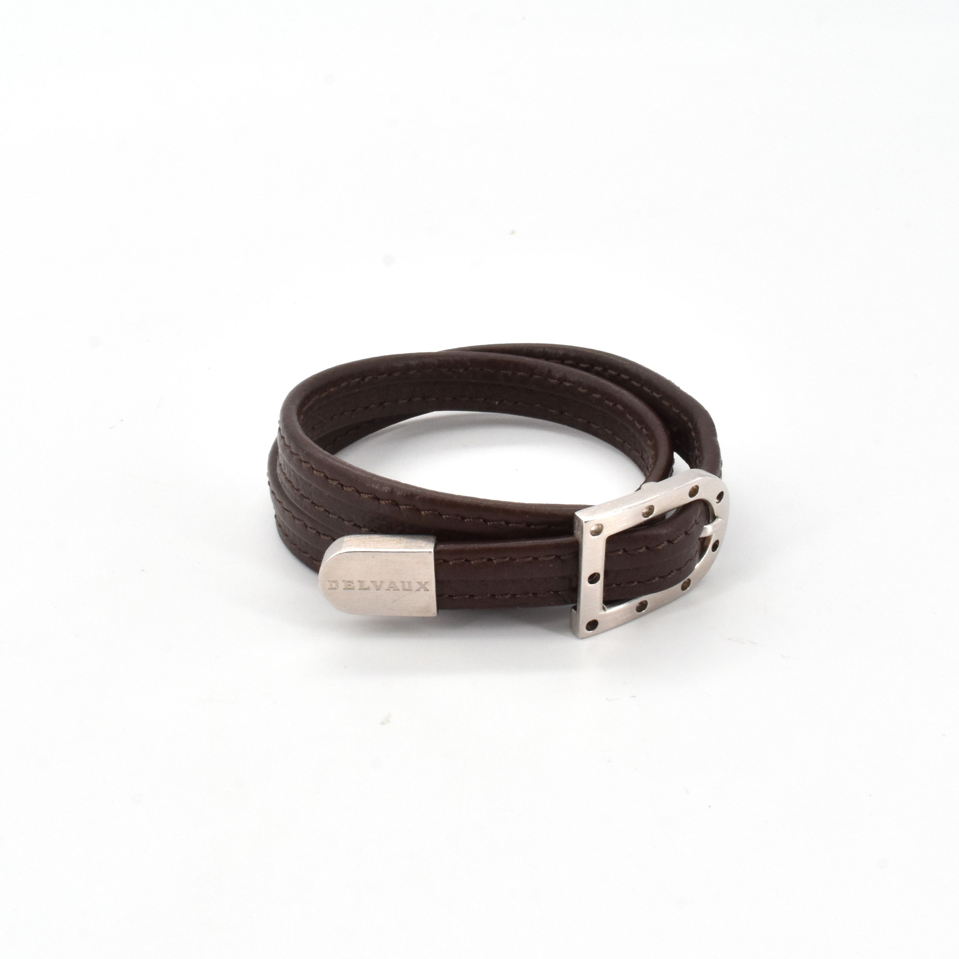 Armband in bruin leder met onderdelen in staal getekend DELVAUX + originele doos, pochette & garantie