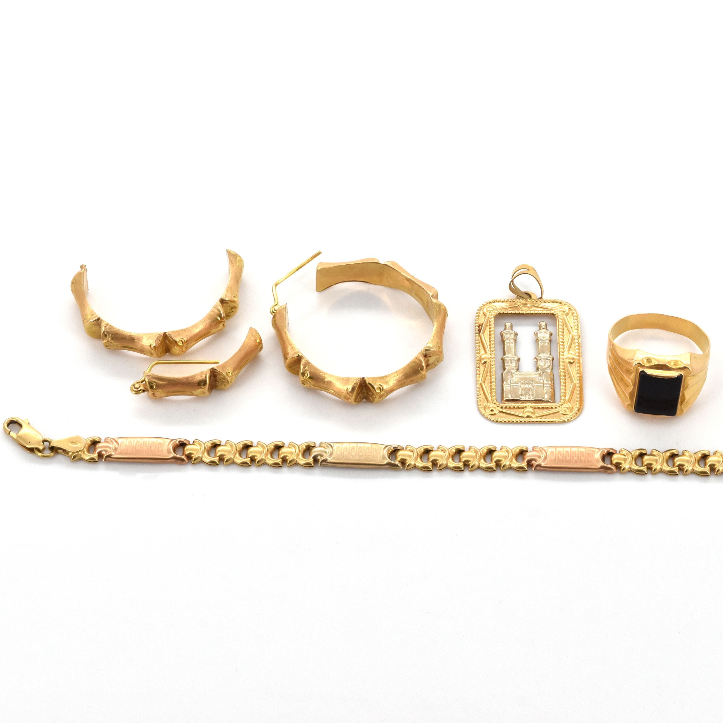 Ring, hanger, armband en 2 oorringen in 18 kt 3-kleurengoud (kleursteen, gebroken, stuk los, gedeukt) - 26.5 g (Maat: 65) (19.5 cm)