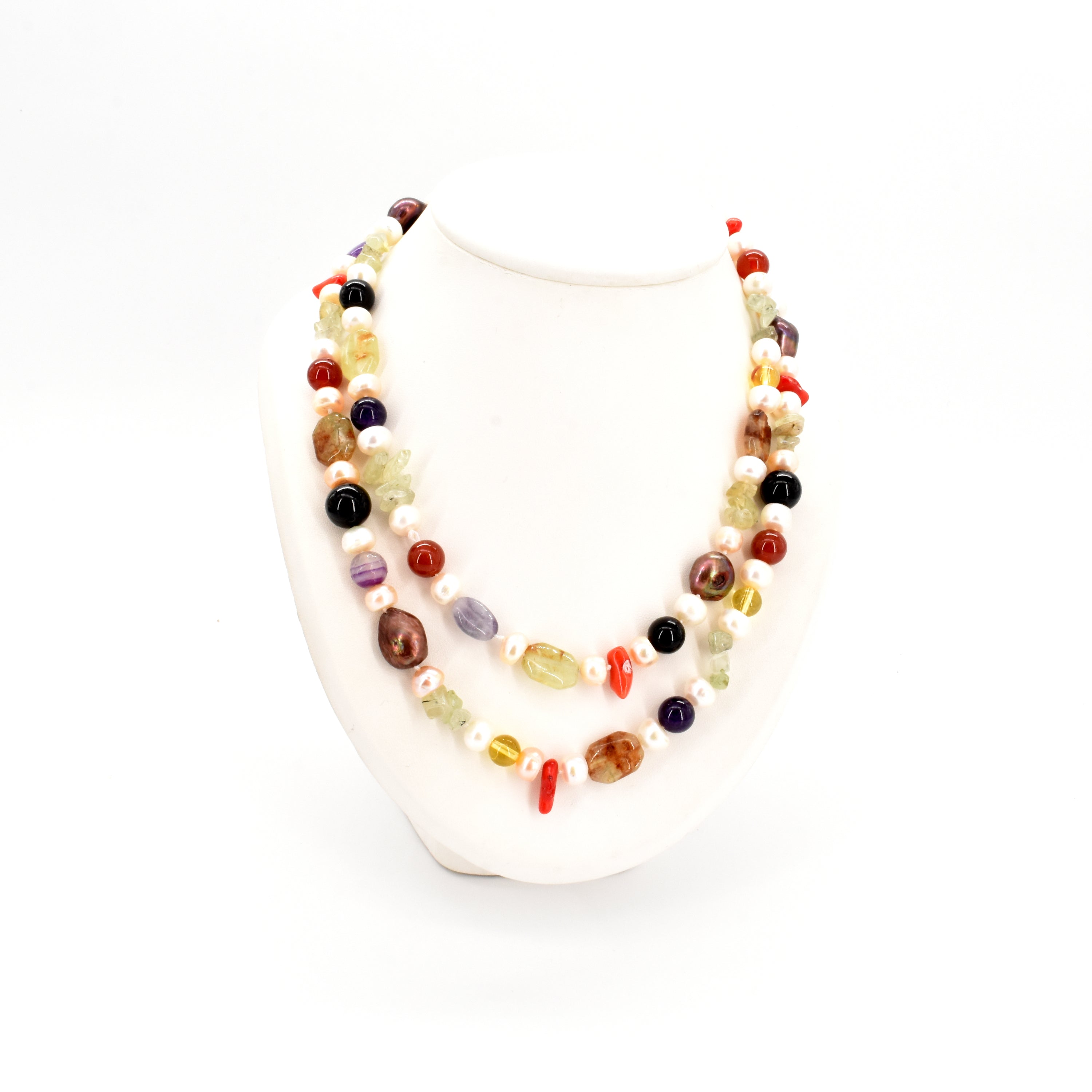 Sautoir van parels, koralen en kleurstenen (+/- 104 cm)
