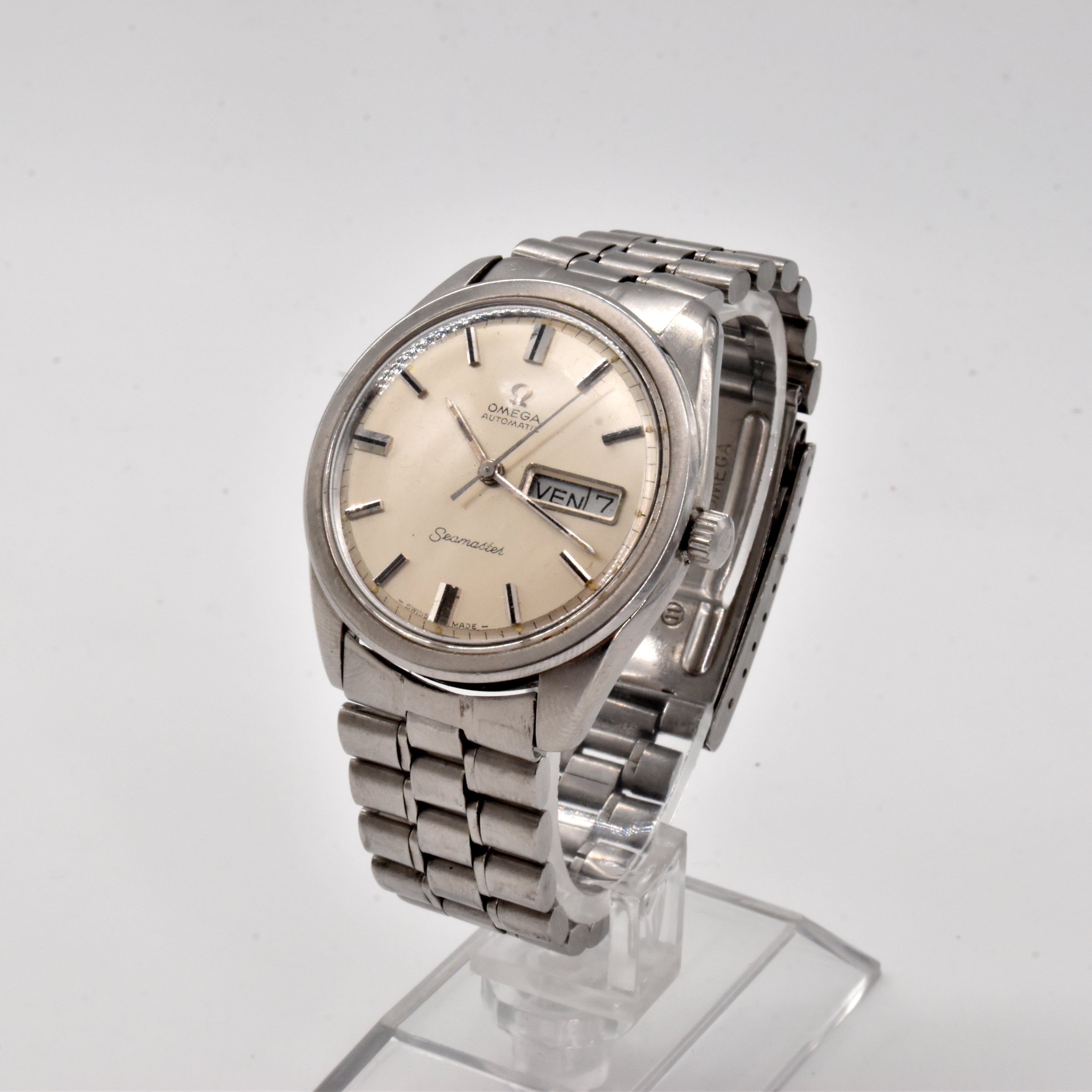 Herenpolshorloge in staal OMEGA Seamaster automatisch (opwinder gebroken, ontregeld, horloge nr. 166.032 168.023, uurwerk nr. 28023922, beschadigd, gedeukt) (+/- 17 cm)