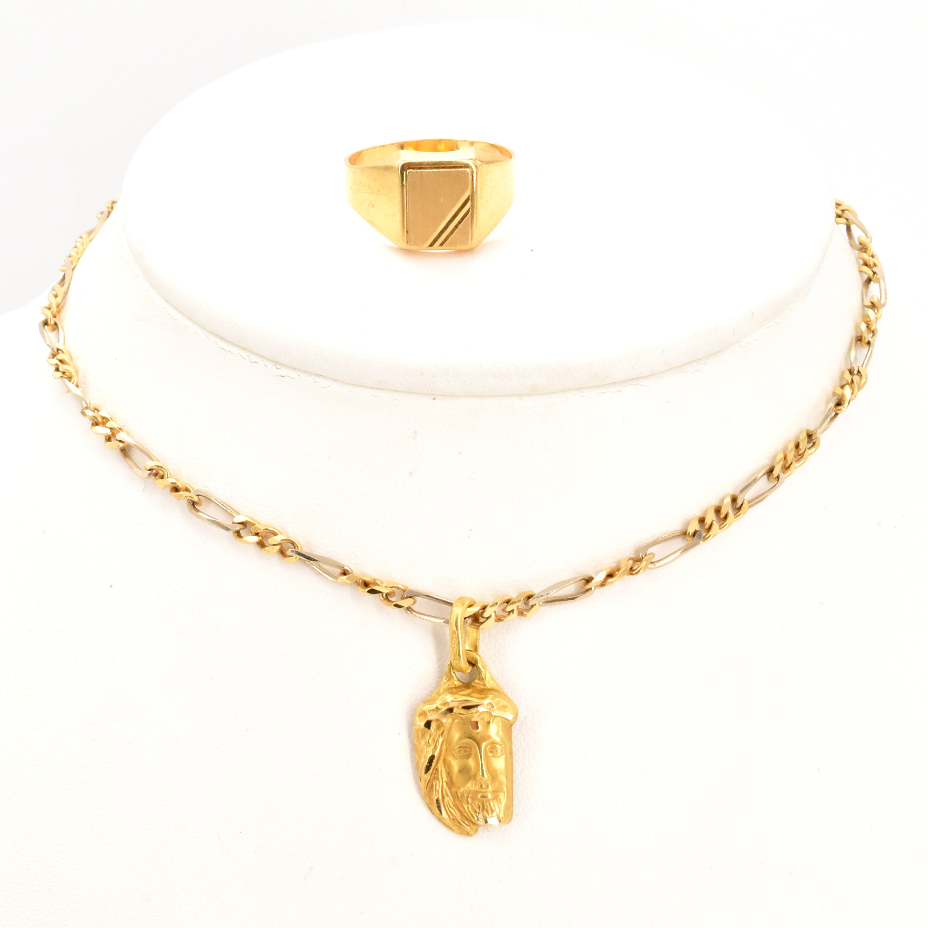 Zegelring, halsketting en hanger in 18 kt geel- en witgoud - 19 g (Maat: 59) ( 50 cm)