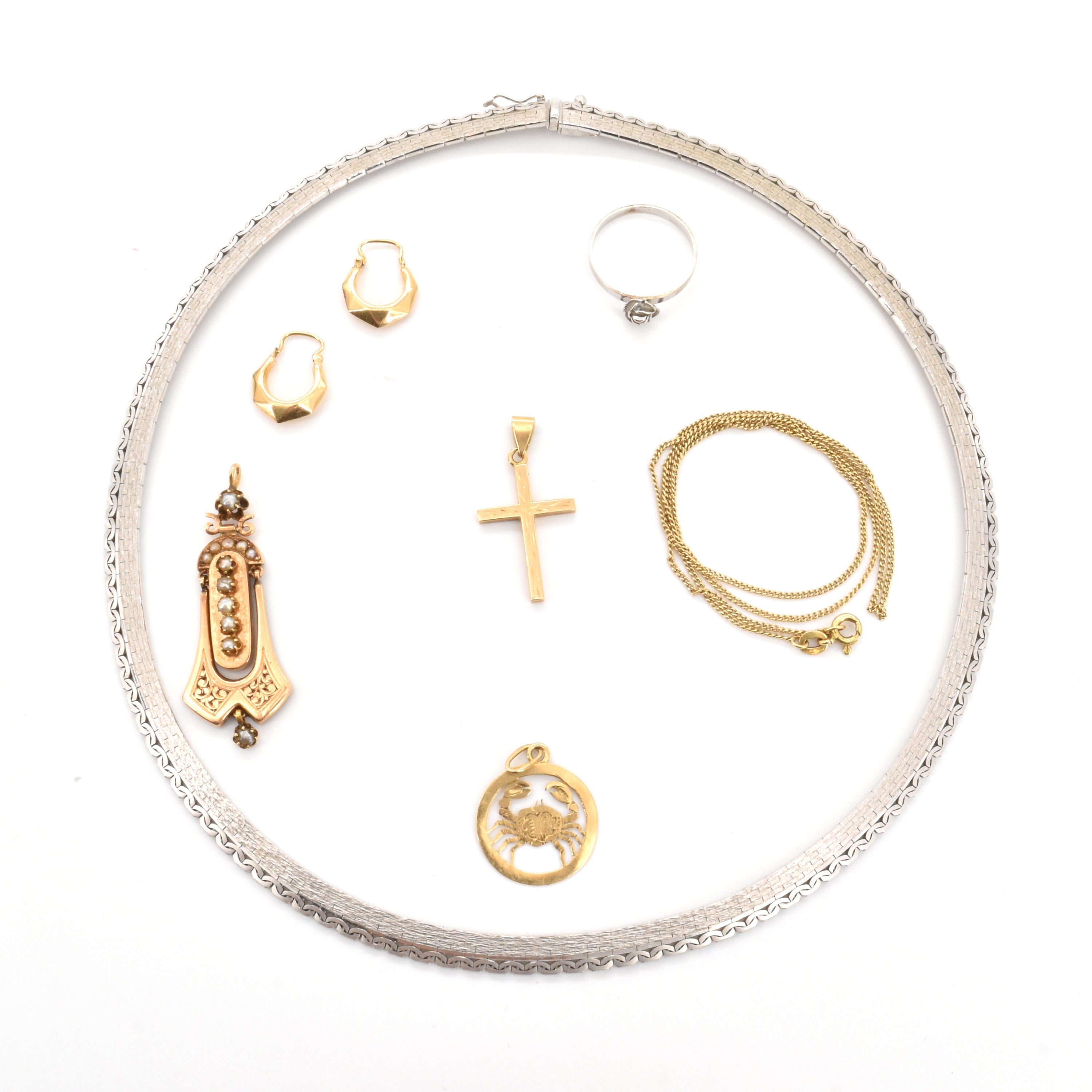 Ring, 2 halskettingen, 2 hangers, kruis en 2 oorringen in 18 kt geel- en witgoud bezet met parels (gedeukt) - 52.9 g bruto (Maat: 54) (43.5 & 45 cm)