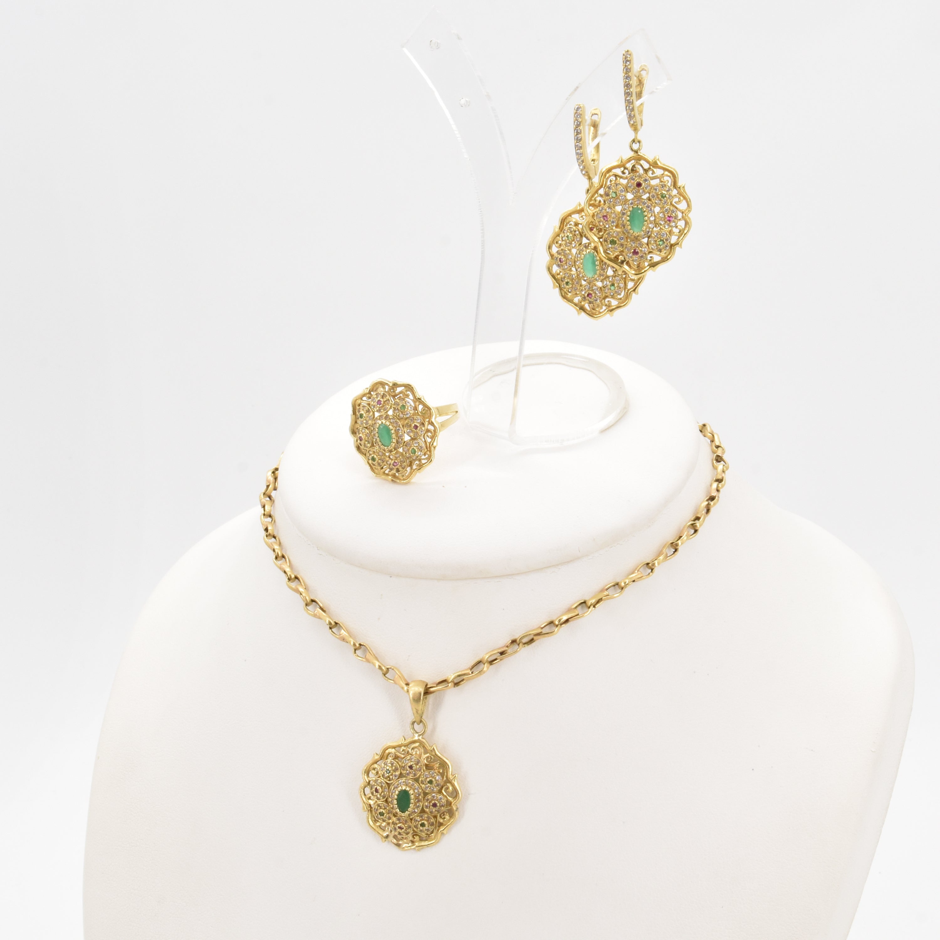 Ring, halsketting, hanger en 2 oorringen in 18 kt geelgoud (valse stenen, kleurstenen, gedeukt) - 22.1 g bruto (Maat: 57) (52 cm)