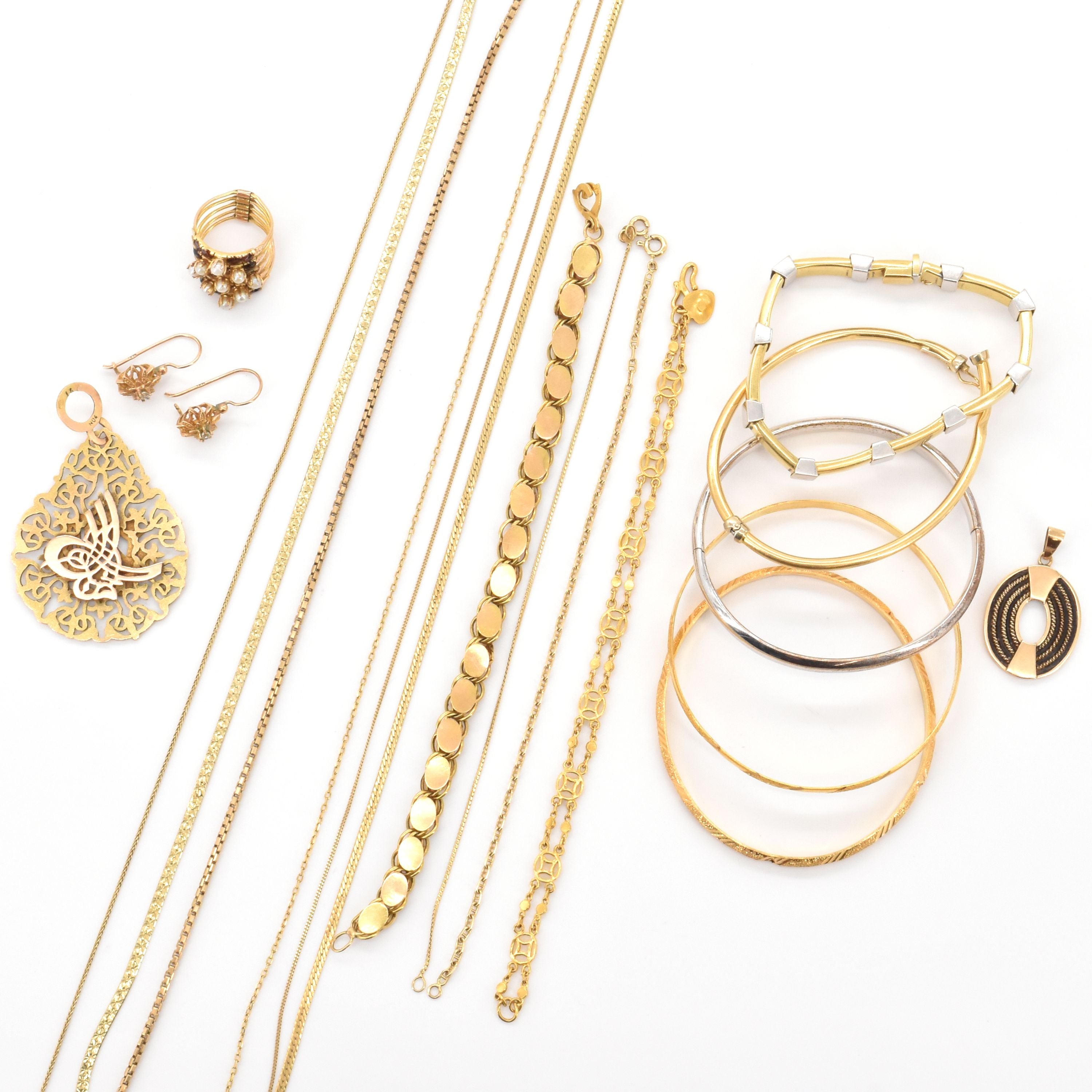 Ring, 3 halskettingen, hanger en 2 oorringen in 14 kt rosé en geelgoud (valse stenen, kleurstenen, parels, beschadigd, gedeukt) - 44.1 g bruto (Maat: 51) (44.5, 45.5 & 48 cm) 3 halskettingen, hanger, 3 onbuigzame armbanden en 5 armbanden waarvan 1 met vastgehechte hanger in 18 kt geel- en witgoud (olifantenhaar, beschadigd, gedeukt) - 83.3 g bruto (40.5, 41 & 50 cm) (17.5, 18 & 19 cm) (2 x 19 cm, 2 x 20 cm & 17 cm) Onbuigzame armband in 22 kt geelgoud - 15 g (20 cm)