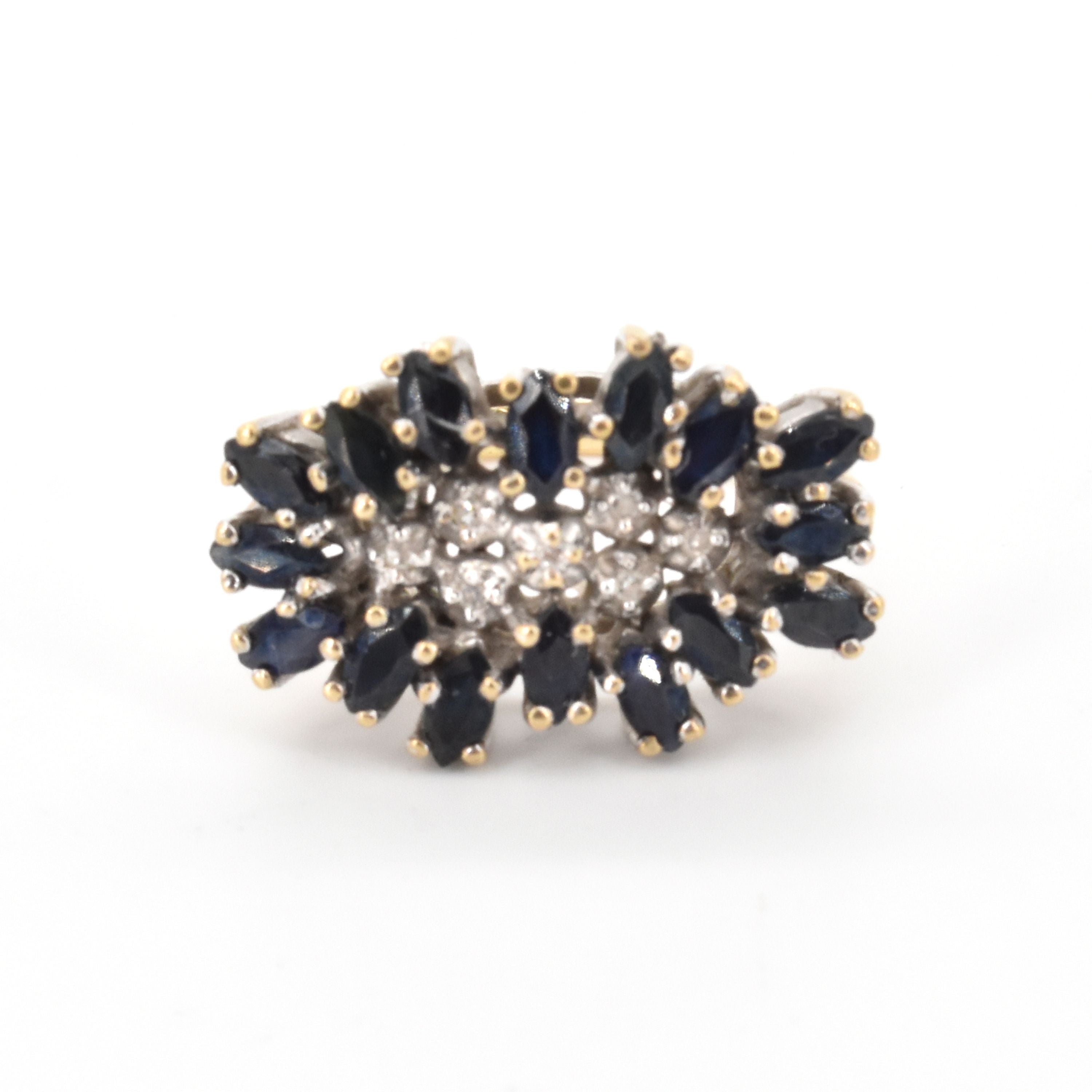 Ring in 9 kt geelgoud en gedeelten in wit metaal bezet met 7 diamanten 8/8 slijpsel +/- 0.07 kt (kleurstenen) - 4.6 g bruto (Maat: 50.5)