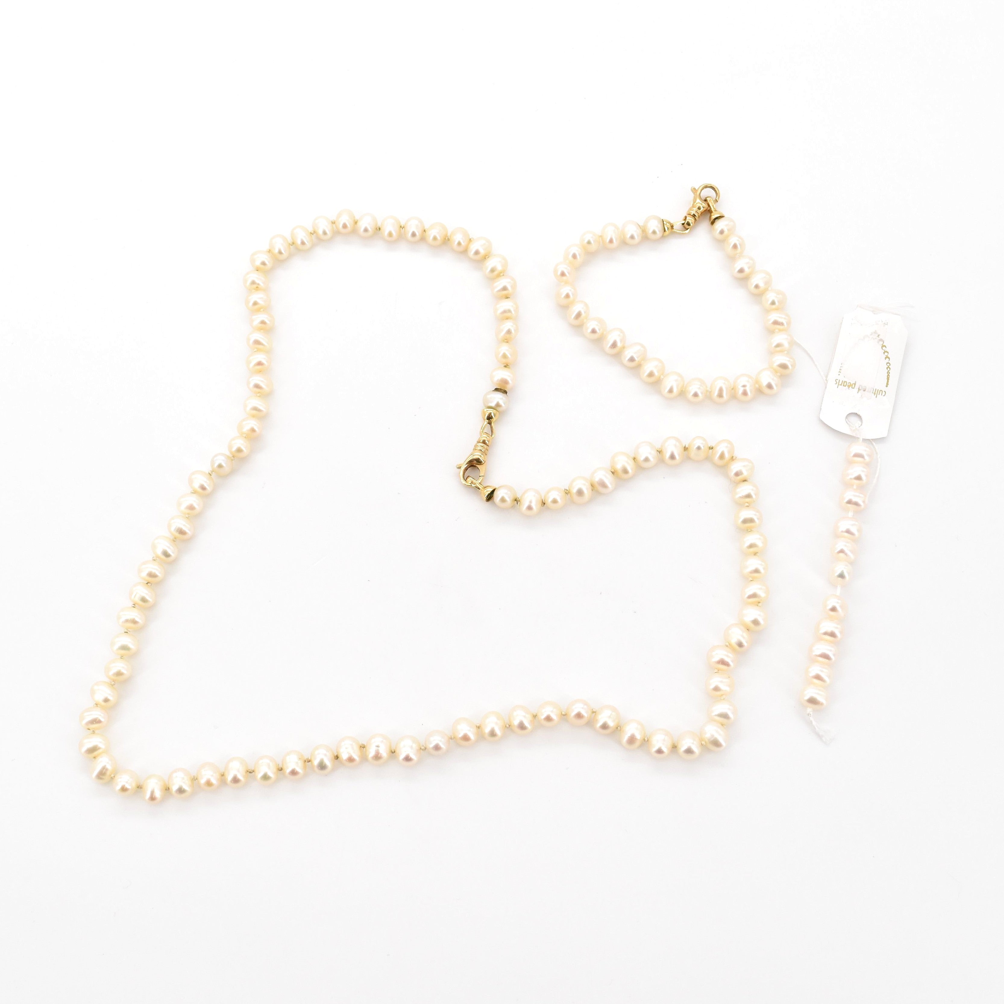 Parelhalsnoer en armband van parels met sluitingen in 18 kt geelgoud + aanvullende parels (62 & 19.5 cm)