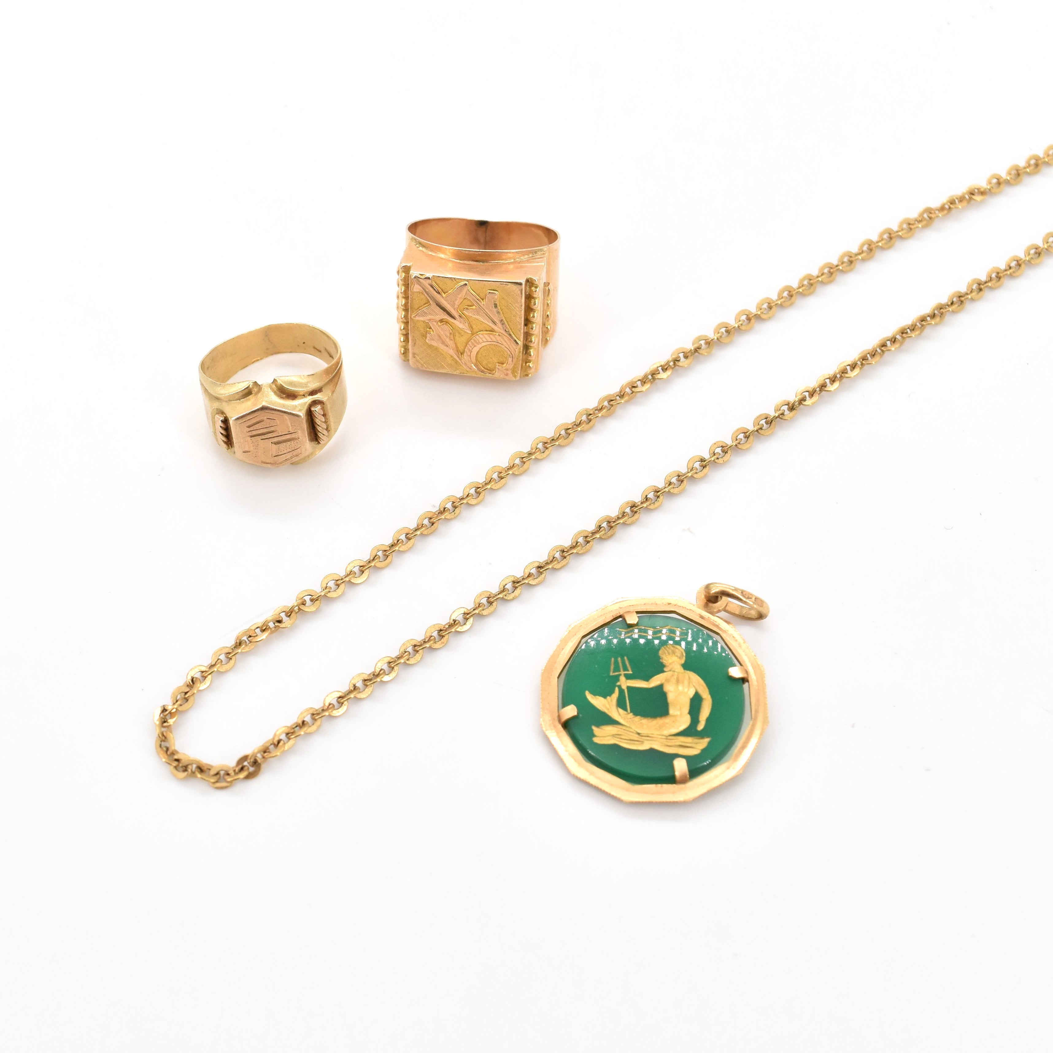 2 zegelringen, ketting en hanger in 18 kt geelgoud (kleursteen, gepersonaliseerd, beschadigd, gedeukt) - 27.4 g bruto (Maten: 53 & 58) (49 cm)