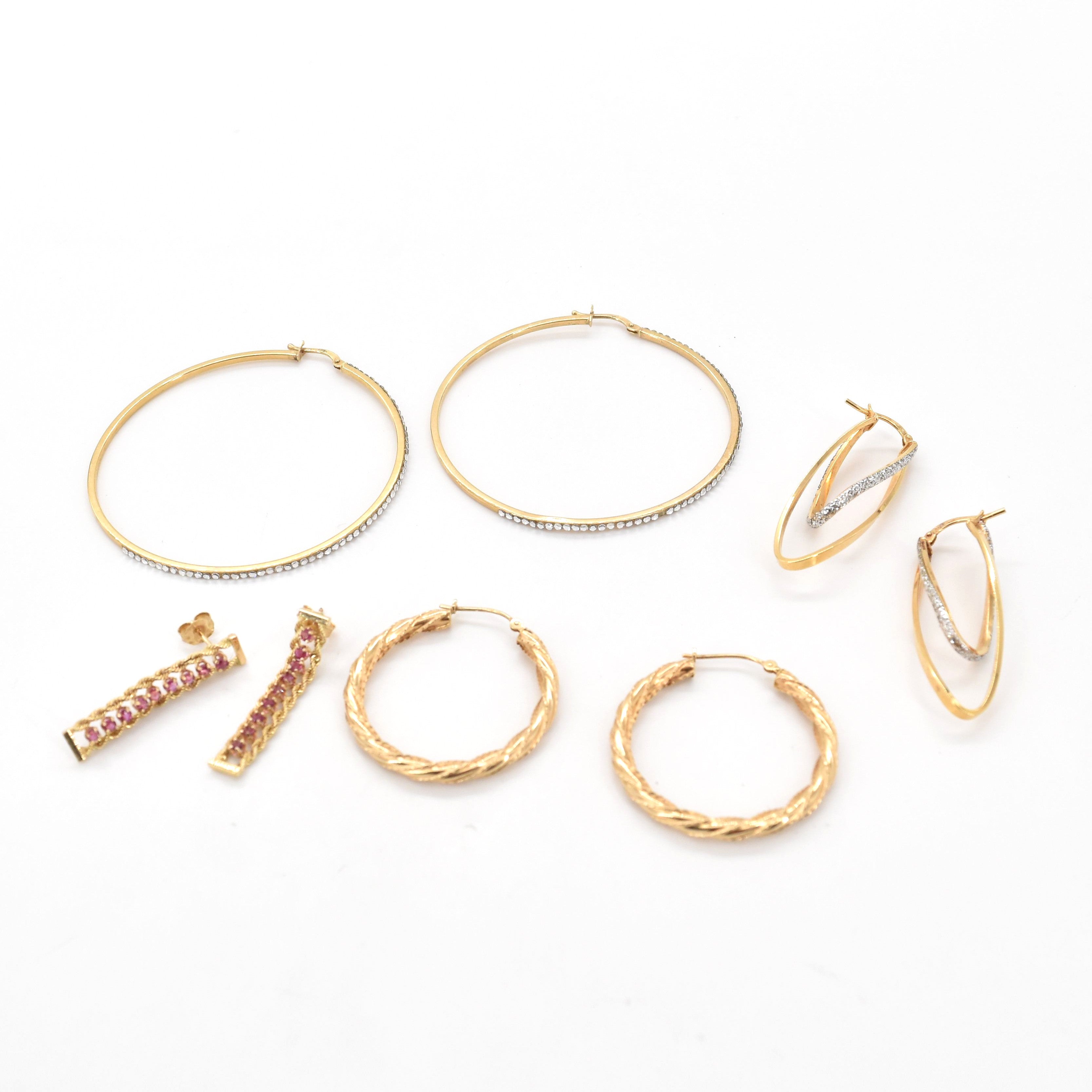 4 oorringen in 9 kt geel- en witgoud (valse stenen, steen ontbreekt, gedeukt) - 4.7 g bruto 4 oorringen in 14 kt geelgoud (kleurstenen, gedeukt) - 5.5 g bruto