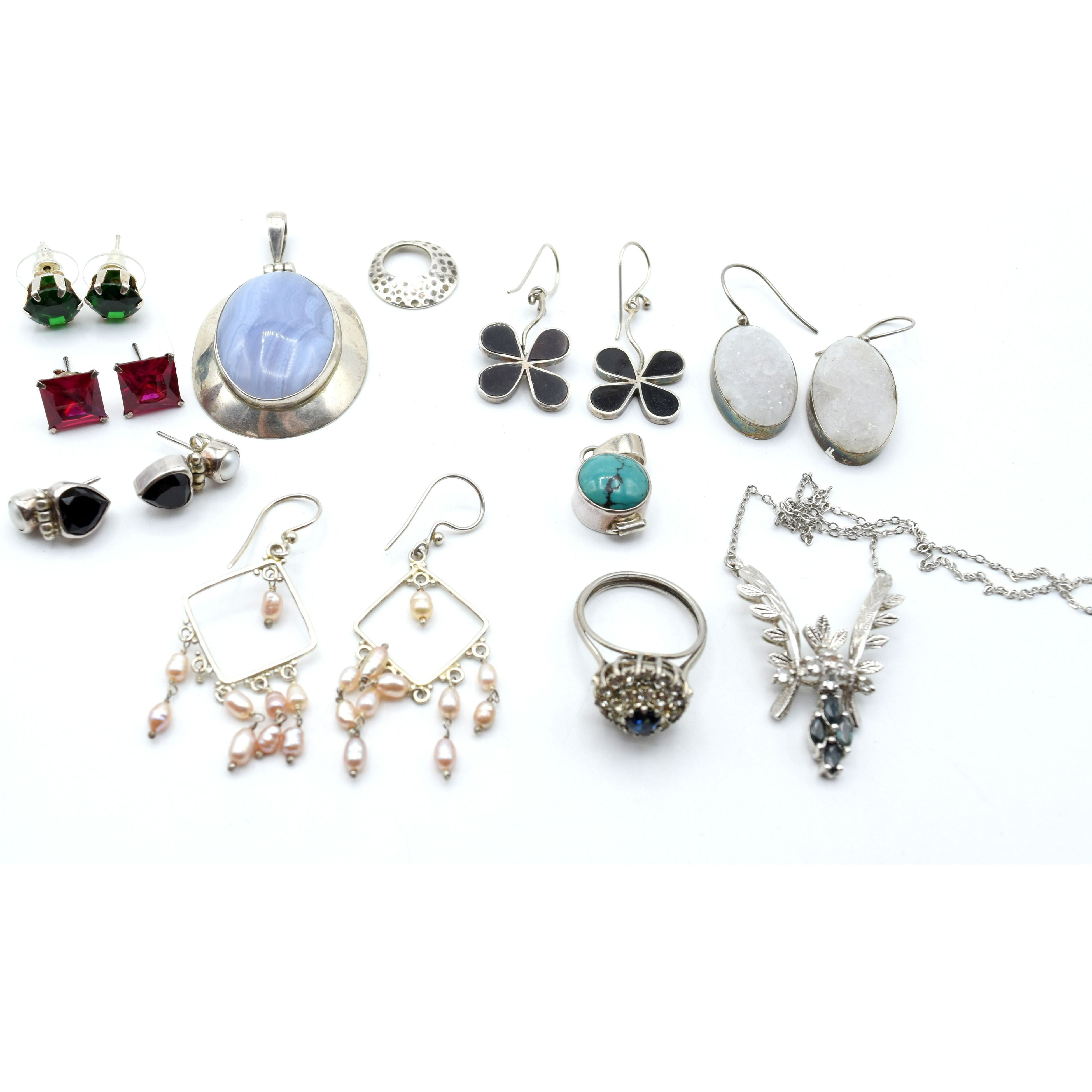 Lot de bijoux en argent sertis de quartz, perles et pierres synthétiques (perles manquent, parties en métal, oxydés) - 55.4 g brut