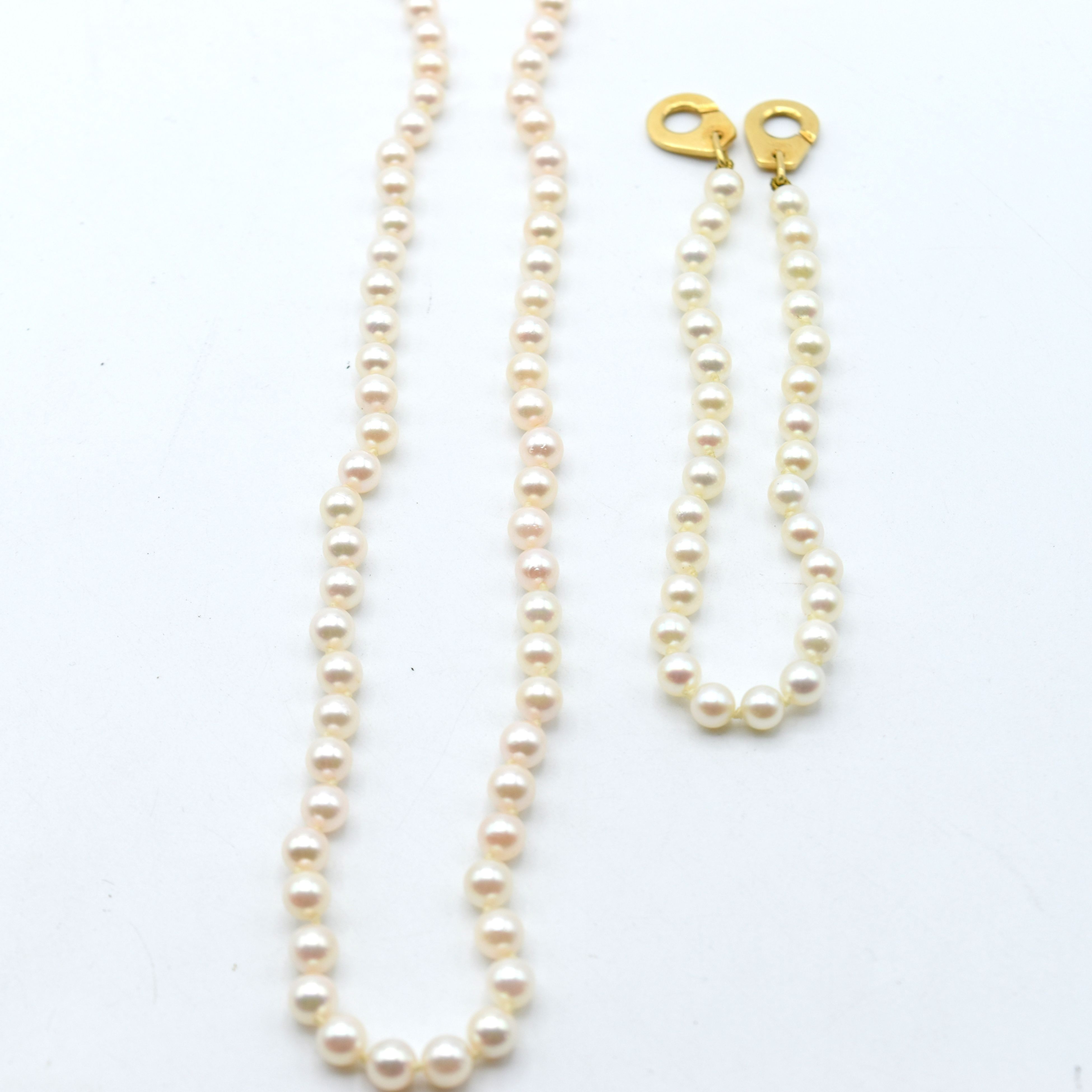 Collier et bracelet de perles (+/- 4.5 mm) avec fermoirs en or jaune 18 ct (41 & 19 cm)