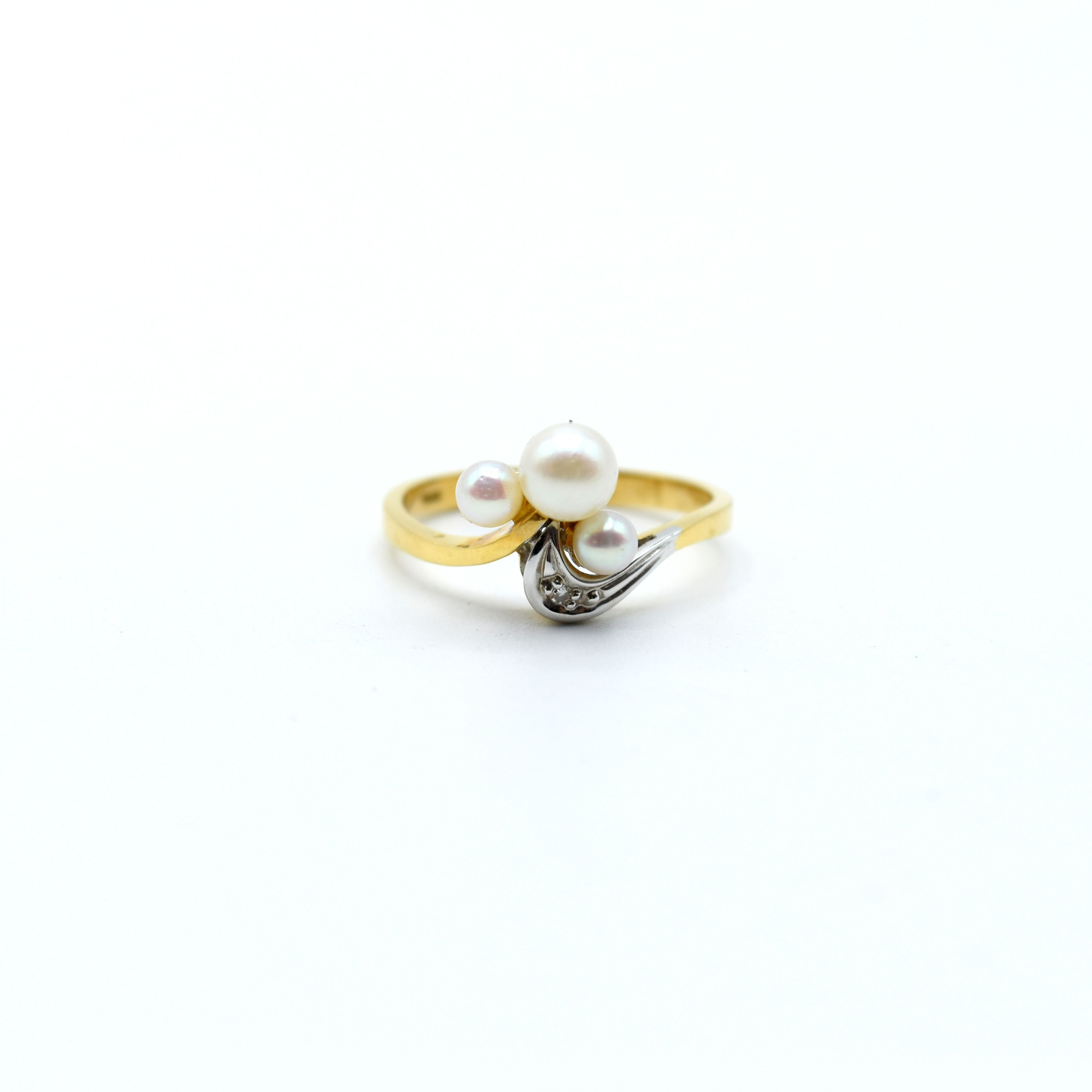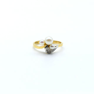 Bague en or jaune et blanc 18 ct sertie d'1 diamant taille 8/8 +/- 0.01 ct et 3 perles - 2.8 g brut (Taille: 53)