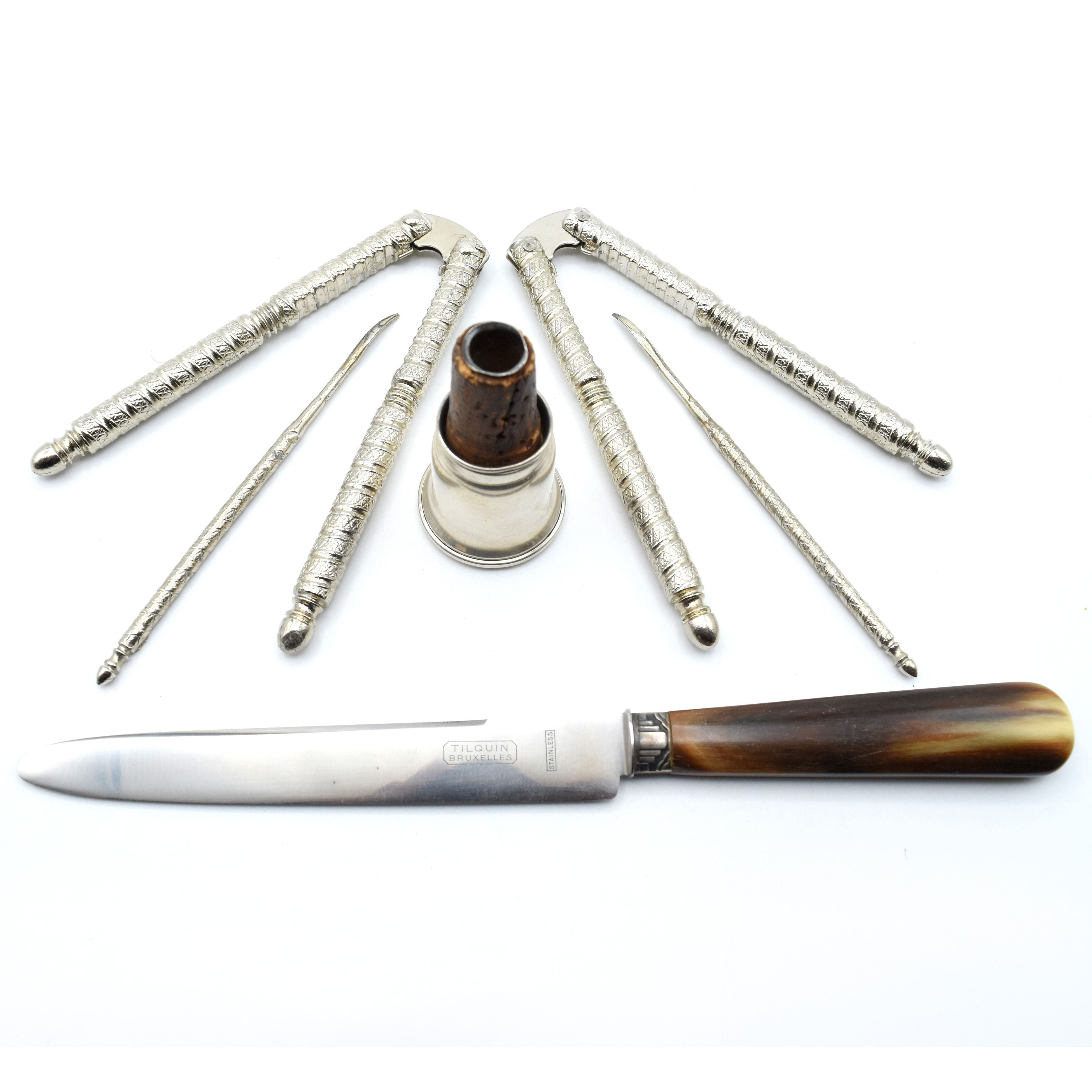 Ménagère de couverts en argent 800/1000 et en argent 835/1000 signés WOLFERS comprenant: 1 pelle à tarte, 2 bouchons de bouteille, 12 fourchettes à huître, 12 cuillères à café, 12 cuillères à thé, 12 fourchettes à dessert, 12 couverts à diner - 3561.6 g + 12 petits et 12 grands couteaux à lame en acier et manche en corne, 8 crochets et 2 pinces à homard + 11 porte-couverts en verre (verres légèrement ébrechées)+ coffret en bois