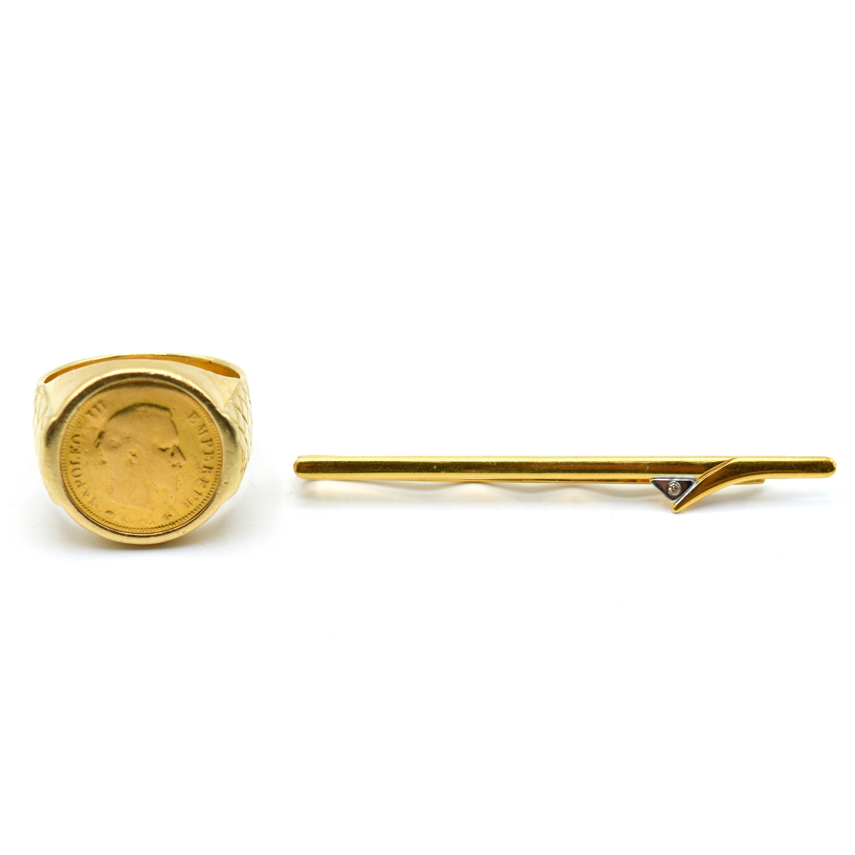 Chevalière en or jaune 18 ct sertie d'1 pièce de monnaie - 26 g (Taille: 68) Pince à cravate en or jaune et blanc 18 ct avec partie en métal sertie d'1 diamant taille 8/8 +/- 0.01 ct - 5.3 g brut