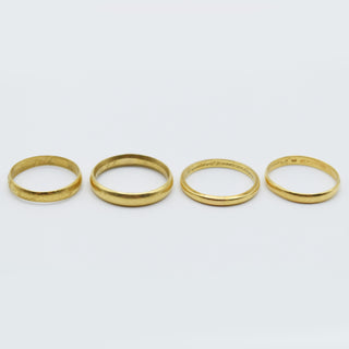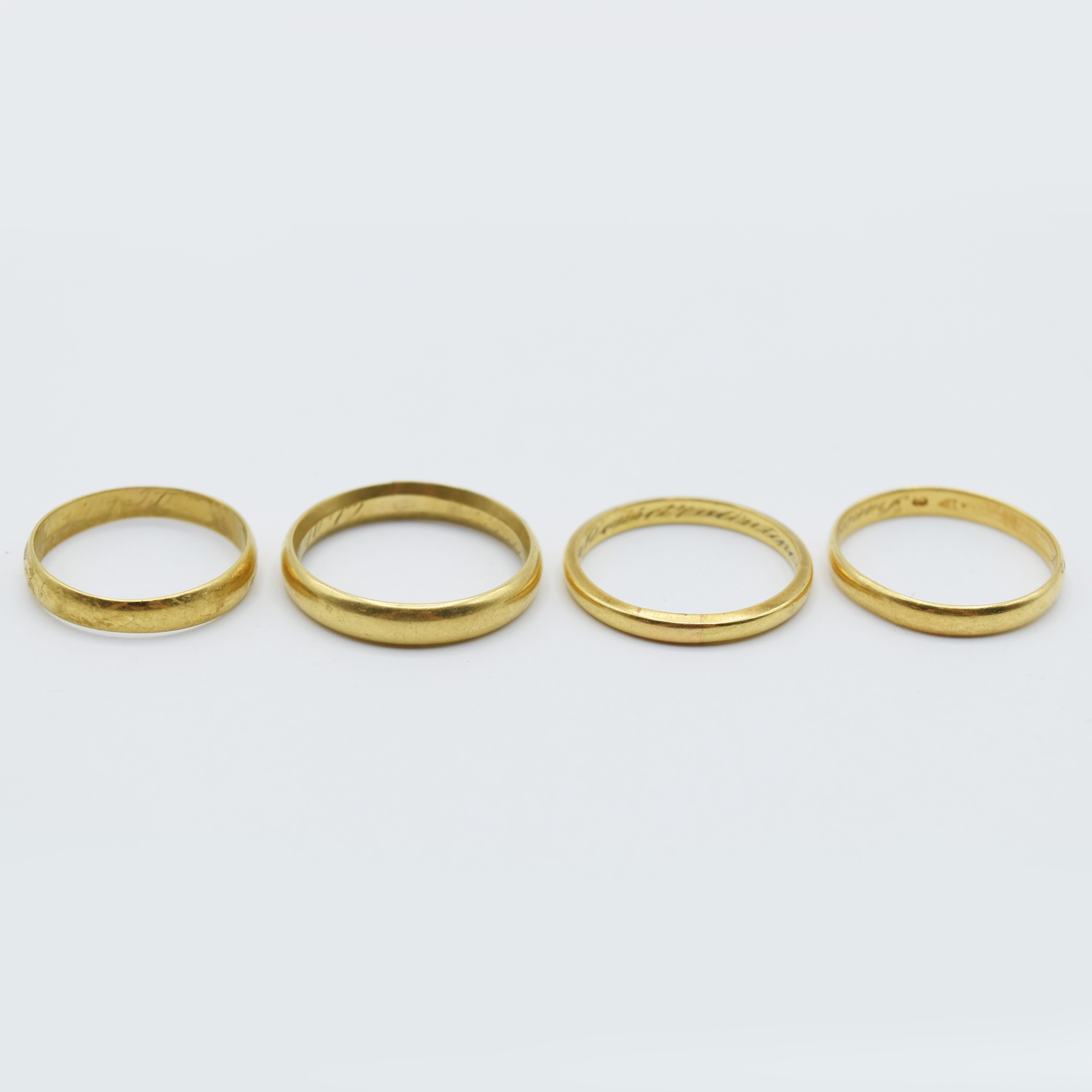 4 alliances en or jaune 18 ct (gravées, abîmées, bosselées) - 11.2 g (Tailles: 54, 56, 57 & 58)