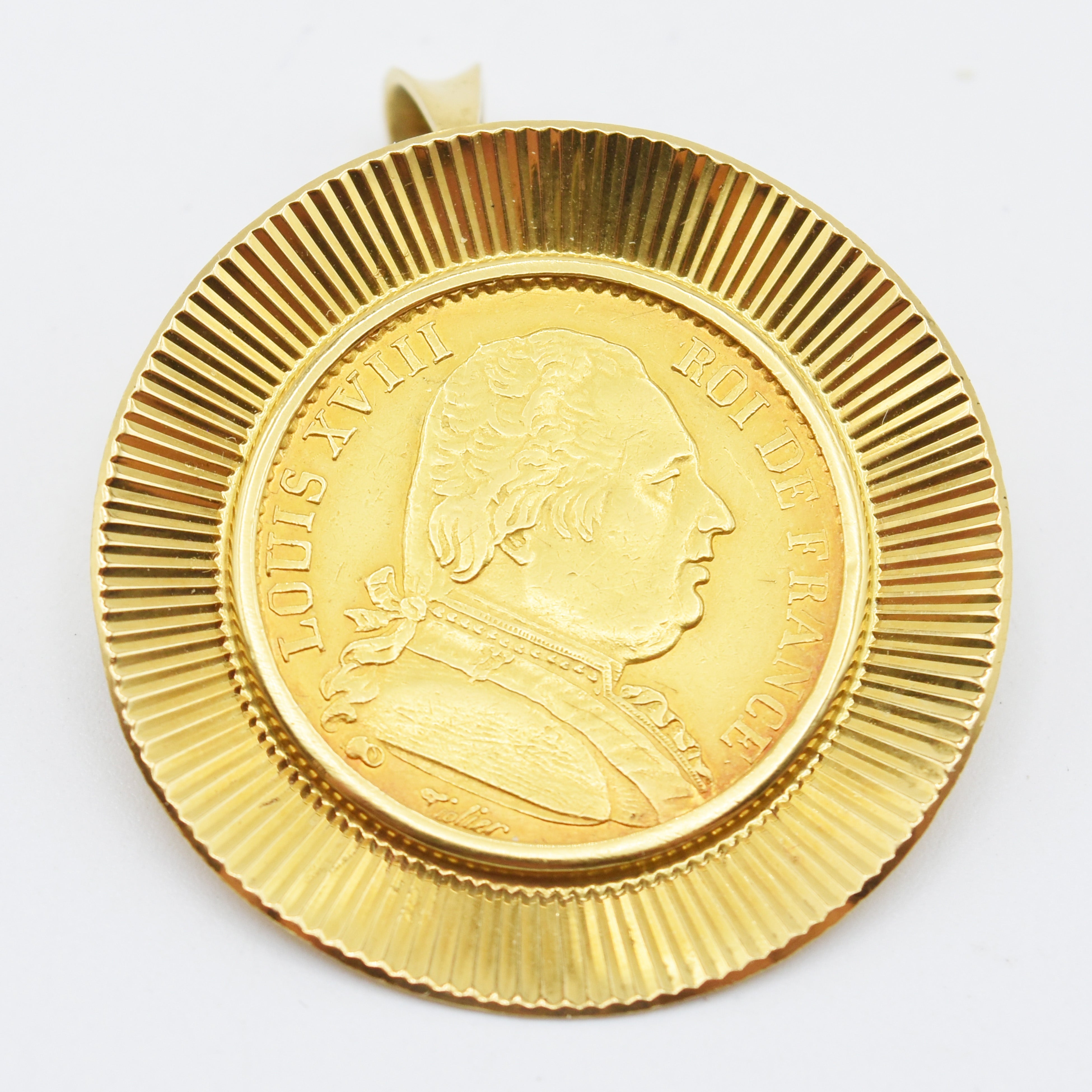 Pendentif/broche en or jaune 18 ct serti d'1 pièce de monnaie en or jaune 900/1000 (française-Louis XVIII-1814) - 11 g brut