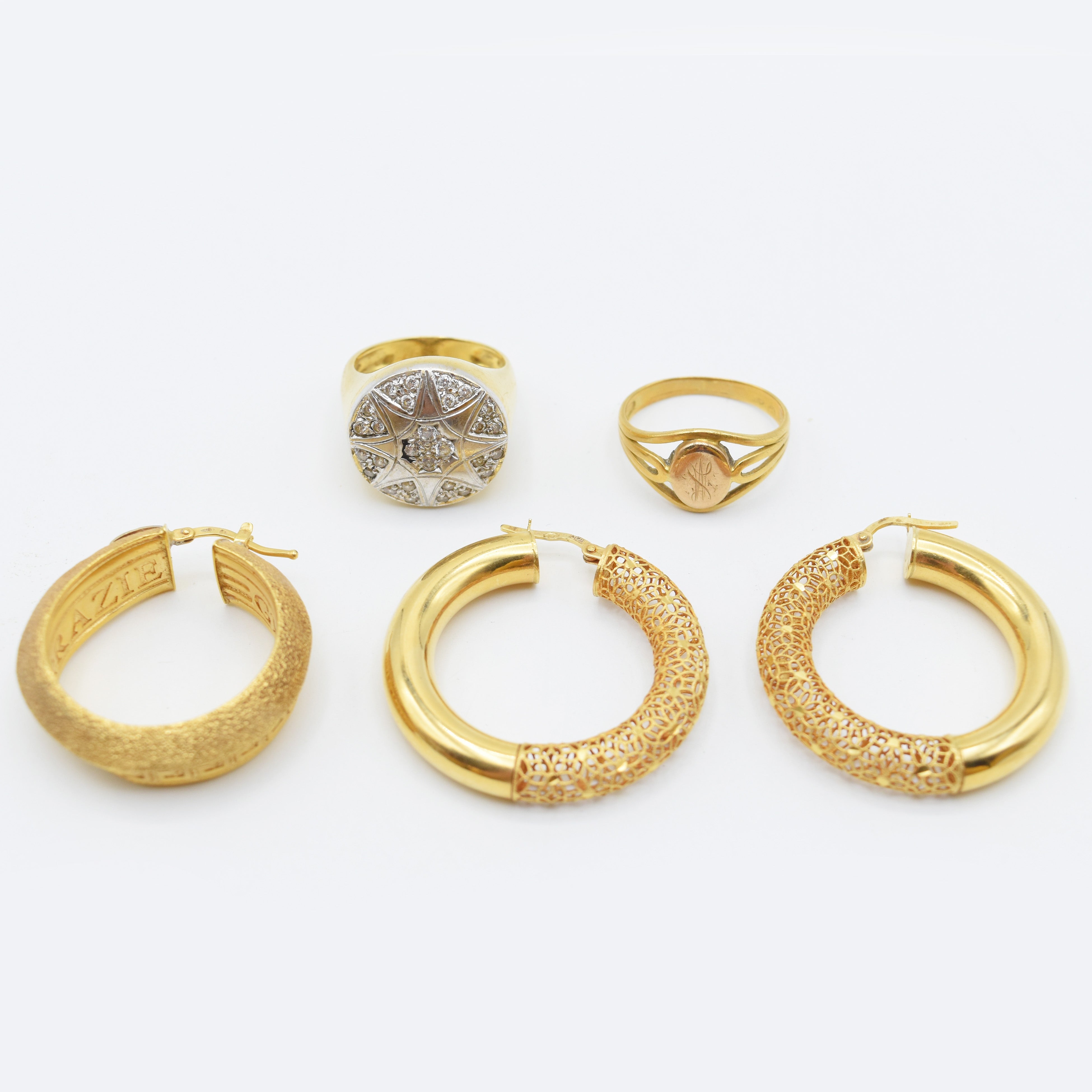 2 bagues et 3 boucles d'oreilles en or jaune et blanc 18 ct (pierres fausses, abîmées, bosselées, gravée, personnalisée) - 27.9 g brut (Tailles: 57 x 2)