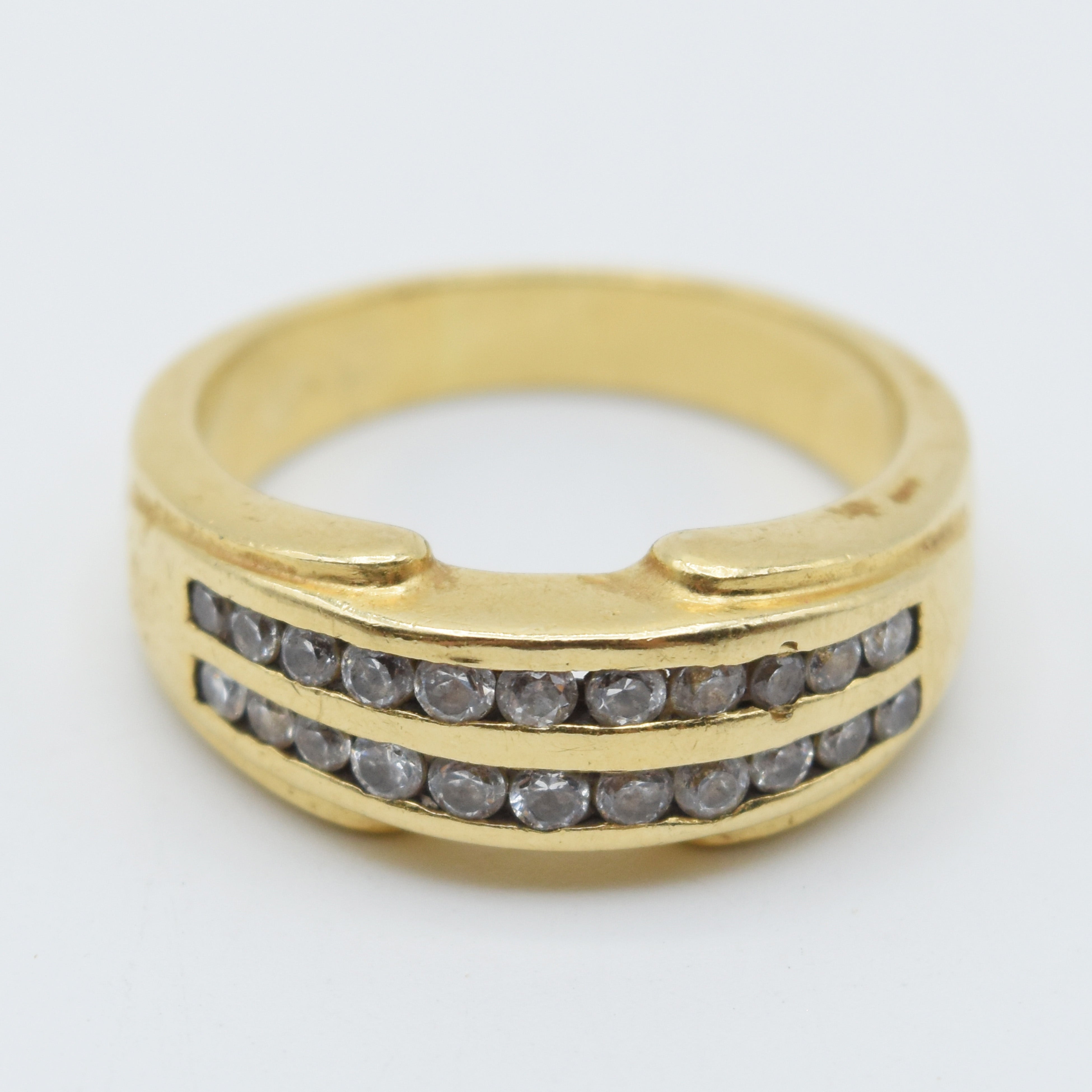 Bague en or jaune 14 ct (pierres fausses, légèrement bosselée) - 7.8 g brut (Taille: 59)