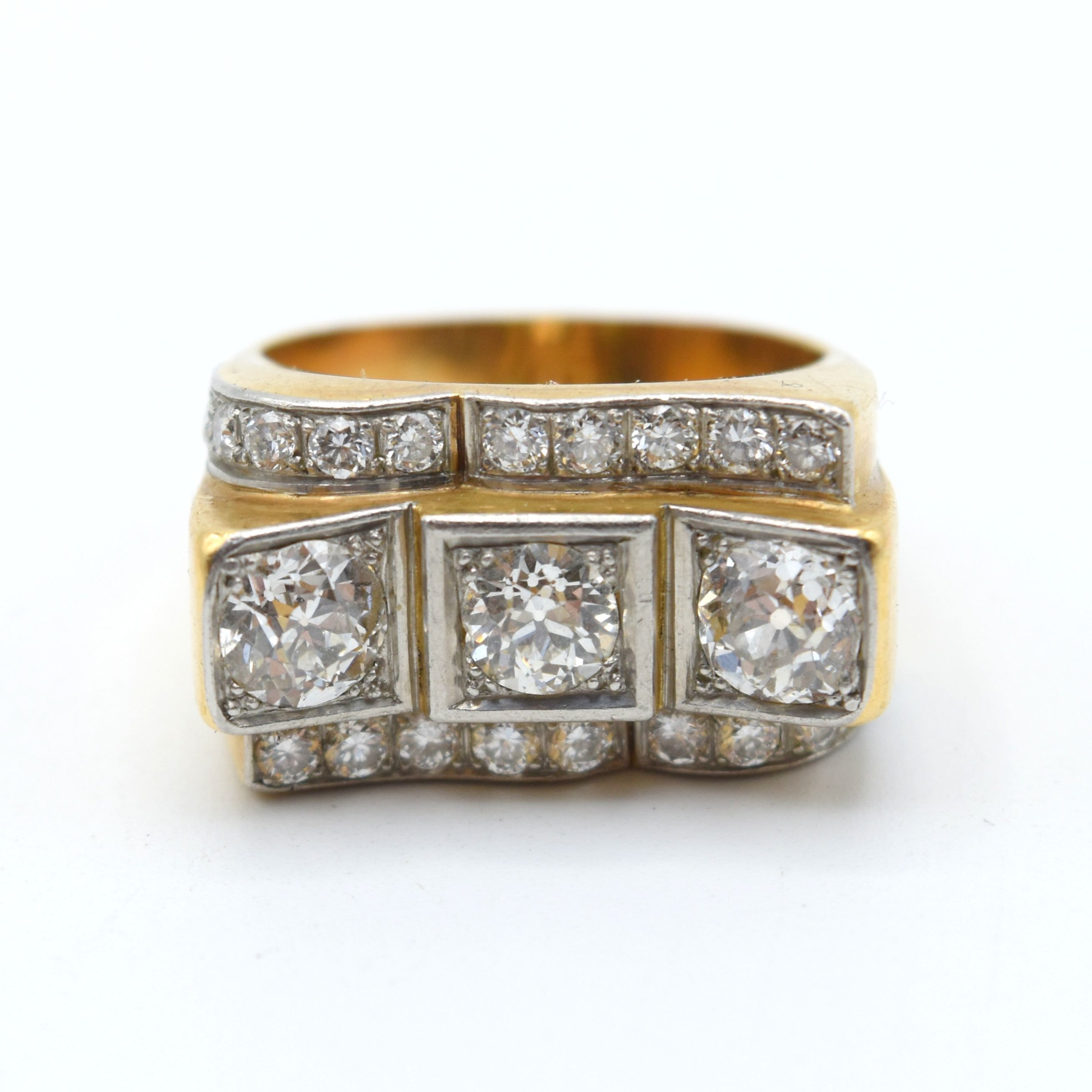 Bague en or jaune 18 ct avec parties en platine sertie de 3 diamants taille ancienne 3 x +/- 0.50 ct et 20 brillants +/- 0.80 ct (pierre légèrement ébréchée) - 9.5 g (Taille: 57)