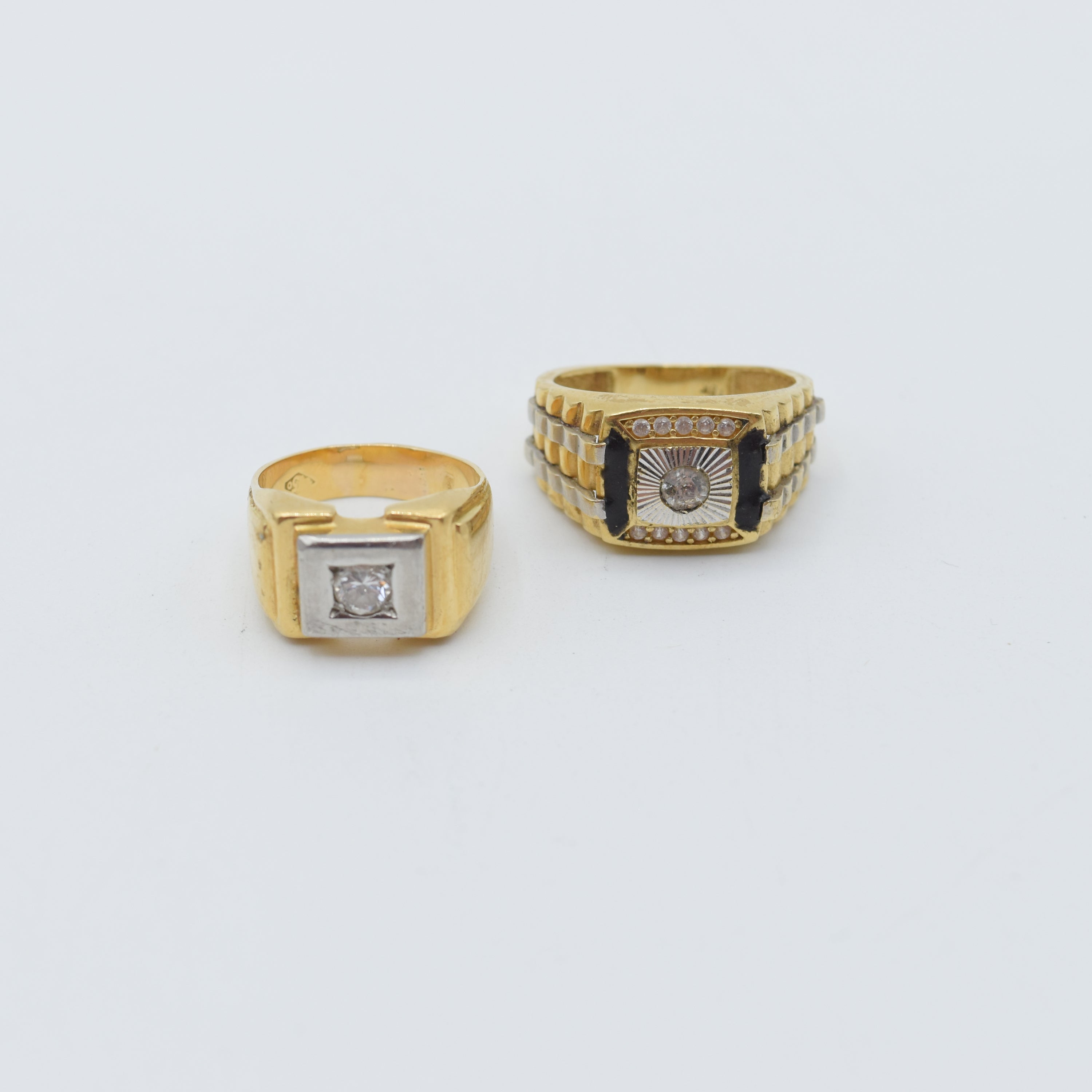 2 chevalières en or jaune et blanc 18 ct avec partie en platine sertie d'1 brillant +/- 0.20 ct (pierres fausses, pierre ébréchée, émail, émail abîmé, abîmées, bosselées) - 20.8 g brut