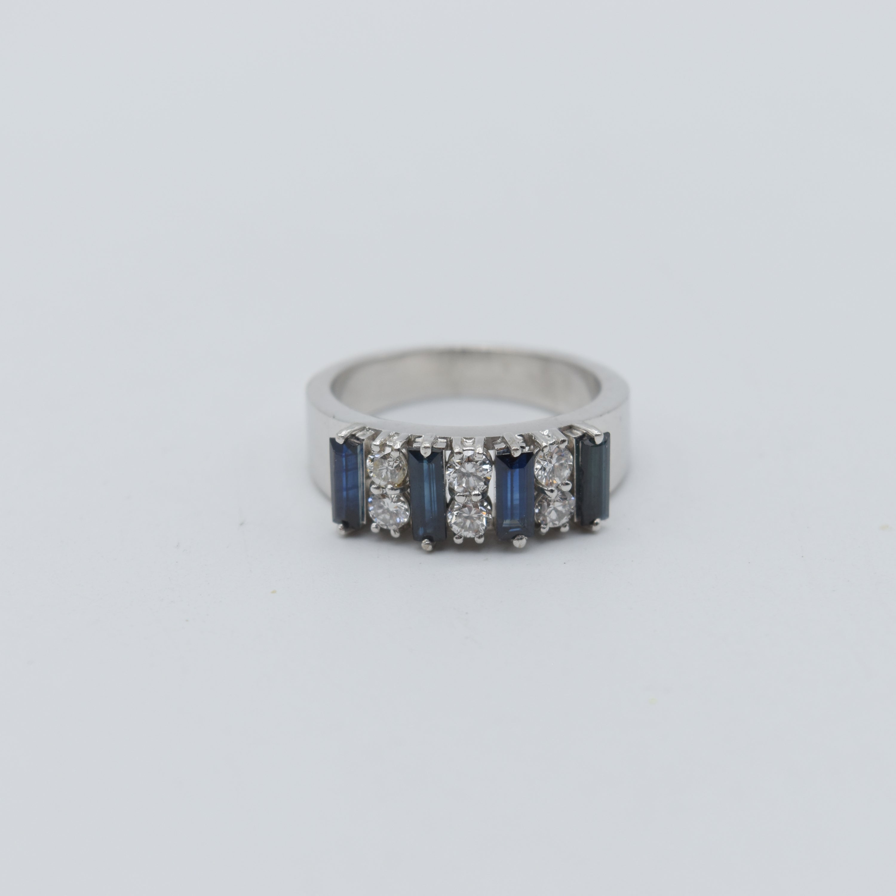 Bague en or blanc 18 ct sertie de 6 brillants +/- 0.50 ct et saphirs (légèrement abîmée) - 7.7 g (Taille: 55.5)