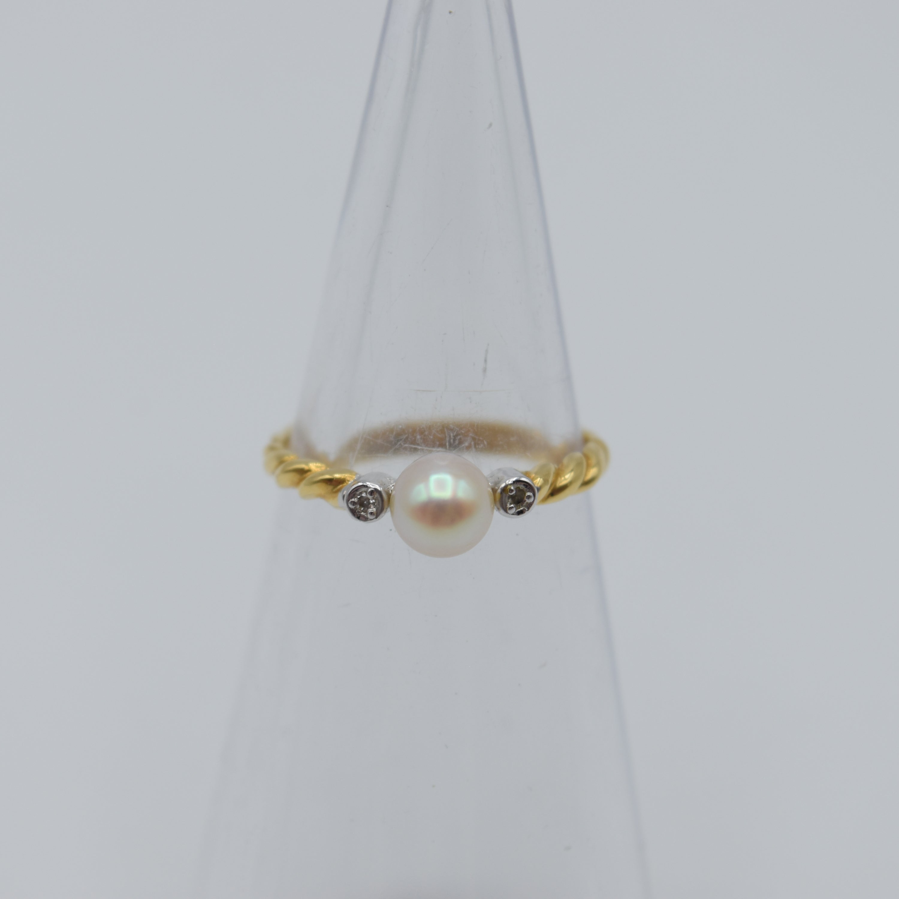 Bague en or jaune et blanc 18 ct sertie de 2 diamants taille 8/8 +/- 0.02 ct et 1 perle - 2.3 g brut (Taille: 54)