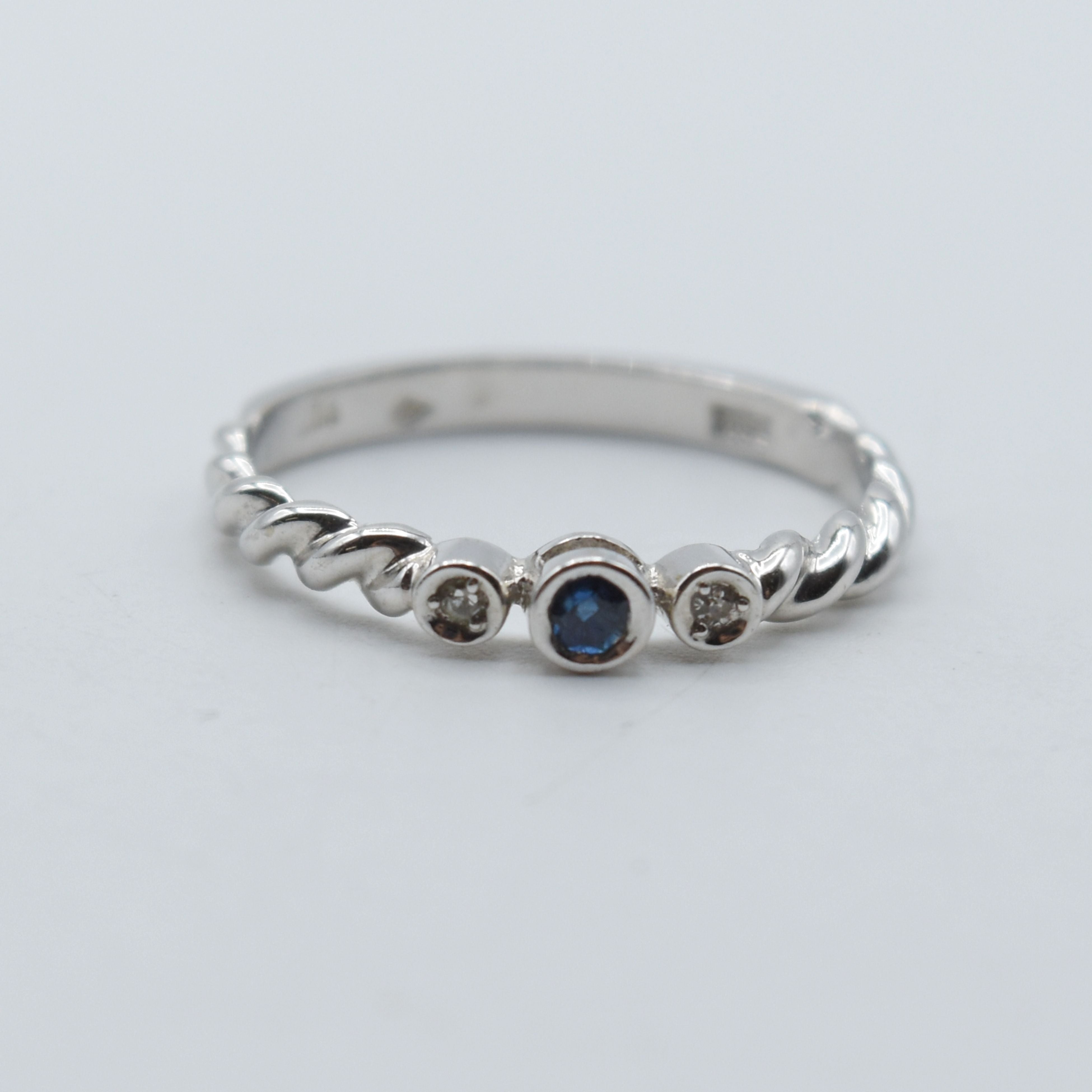 Bague en or blanc 18 ct sertie de 2 diamants taille 8/8 +/- 0.02 ct et 1 saphir - 2 g (Taille: 54)