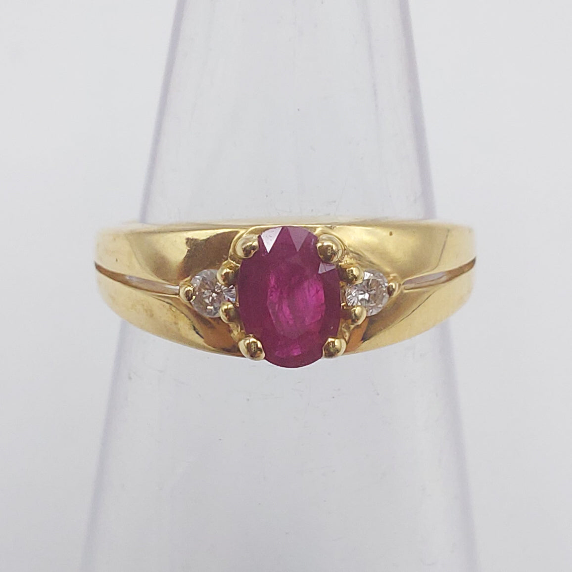 Bague en or jaune 18 ct sertie de 2 brillants +/- 0.06 ct et 1 rubis - 3.4 g (Taille: 52)