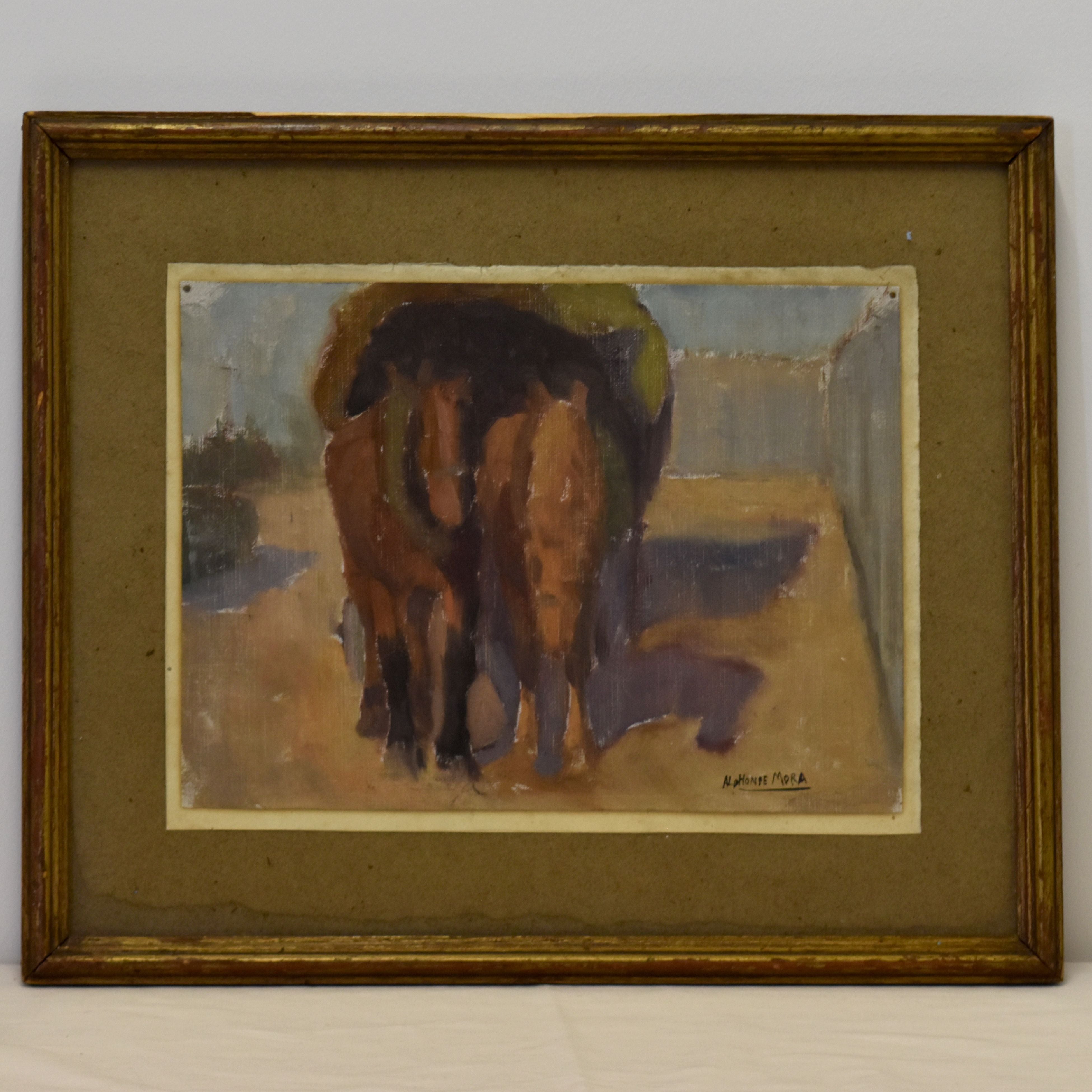 Acrylique sur toile signée Alphonse MORA: Chevaux tirant une carriole (cadre abîmé) (29 x 21 cm)