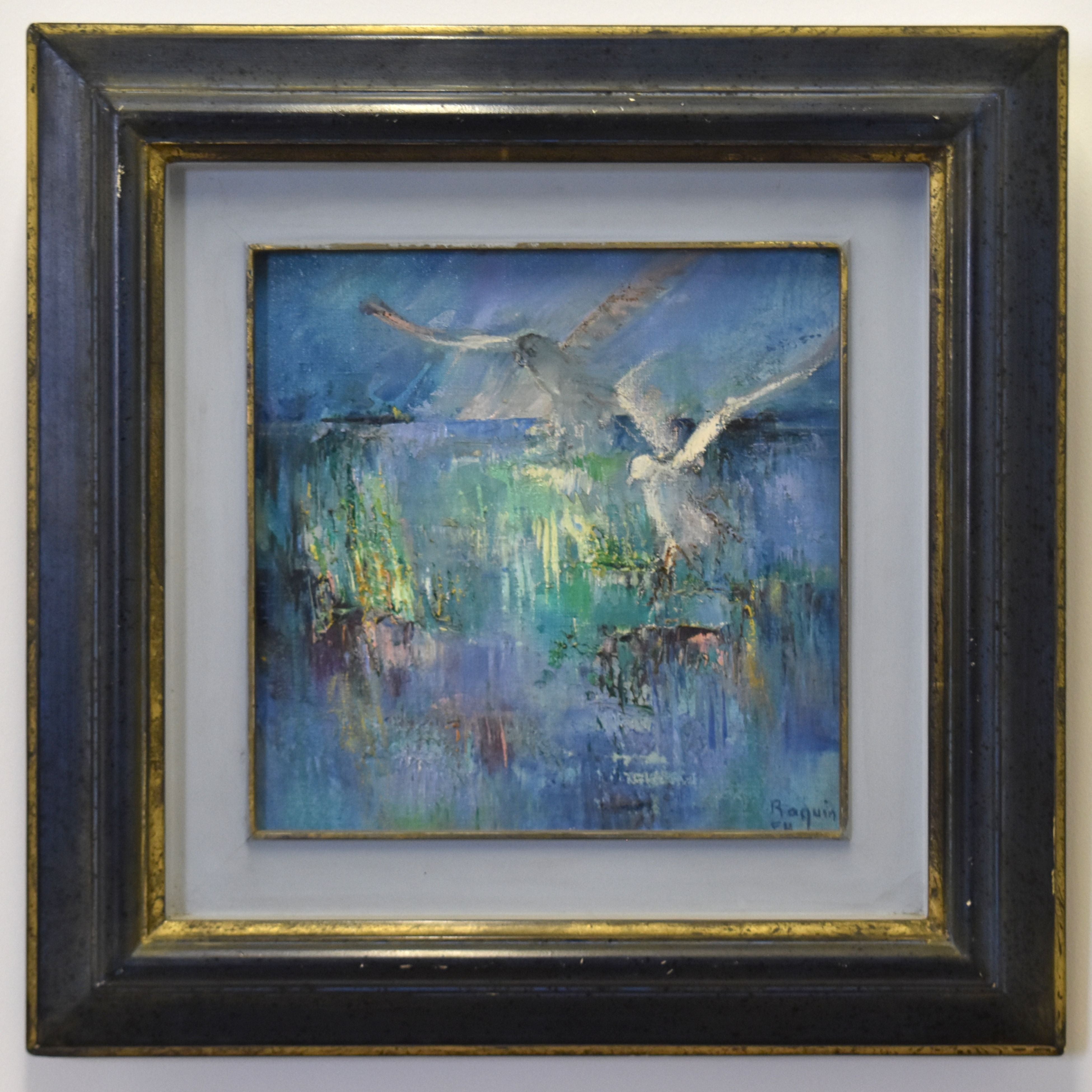 Huile sur toile signée RAQUIN: Les deux mouettes (25 x 25 cm)