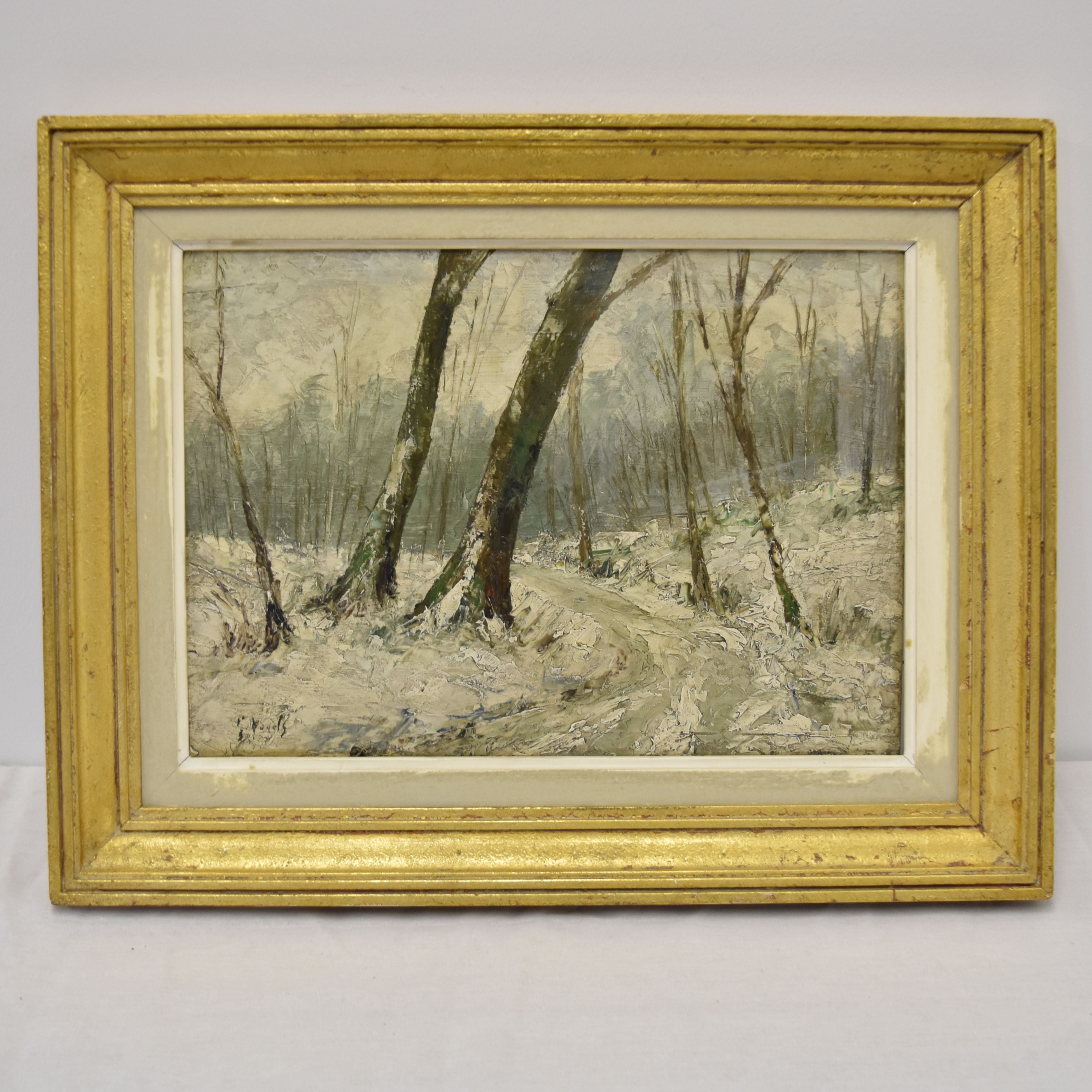 Huile sur panneau signée G. VOGELS: Sous-bois enneigé (toile abîmée) (34 x 24 cm)