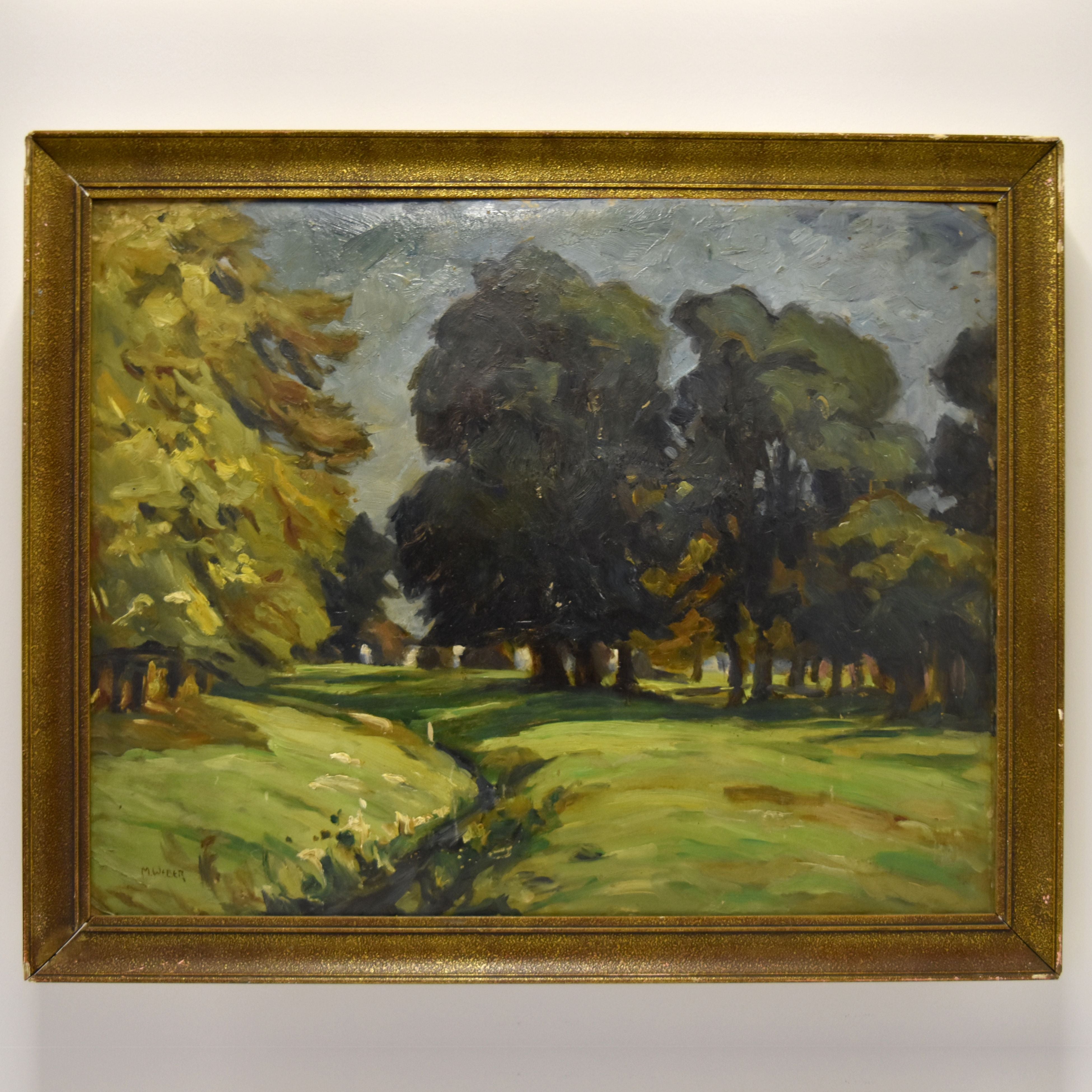 Huile sur panneau signée M. WEBER: Vue de la campagne (cadre et panneau abîmés) (47 x 60 cm)
