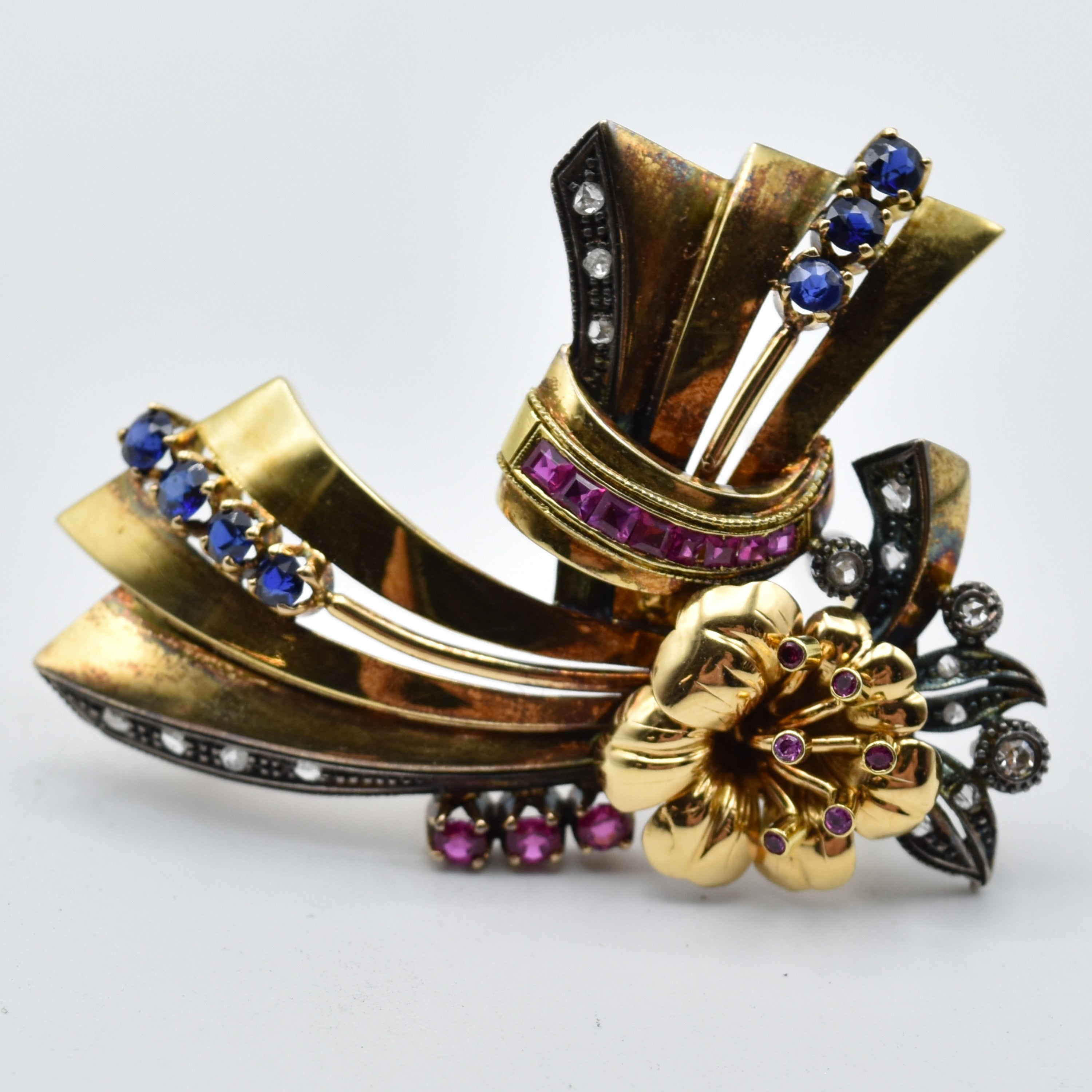 Broche en or jaune 18 ct et argent sertie d'1 diamant taille 8/8 +/- 0.05 ct, roses de diamant et éclats de diamant (pierres de couleur, pierres ébréchées) - 17.5 g brut