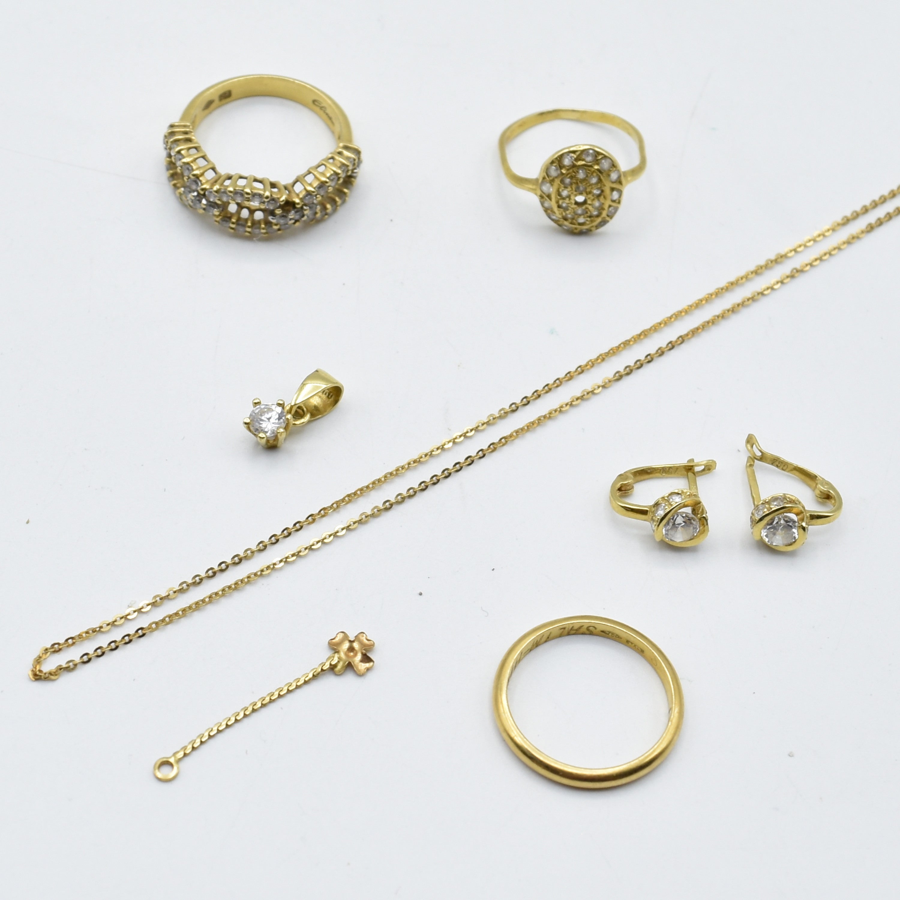 Alliance, 2 bagues, collier, pendentif et 3 boucles d'oreilles en or jaune 18 ct (pierres fausses, pierres manquent, partie manque, personnalisée, gravée, bosselées) - 15.1 g brut (Tailles: 53, 57 & 51) (44.5 cm)