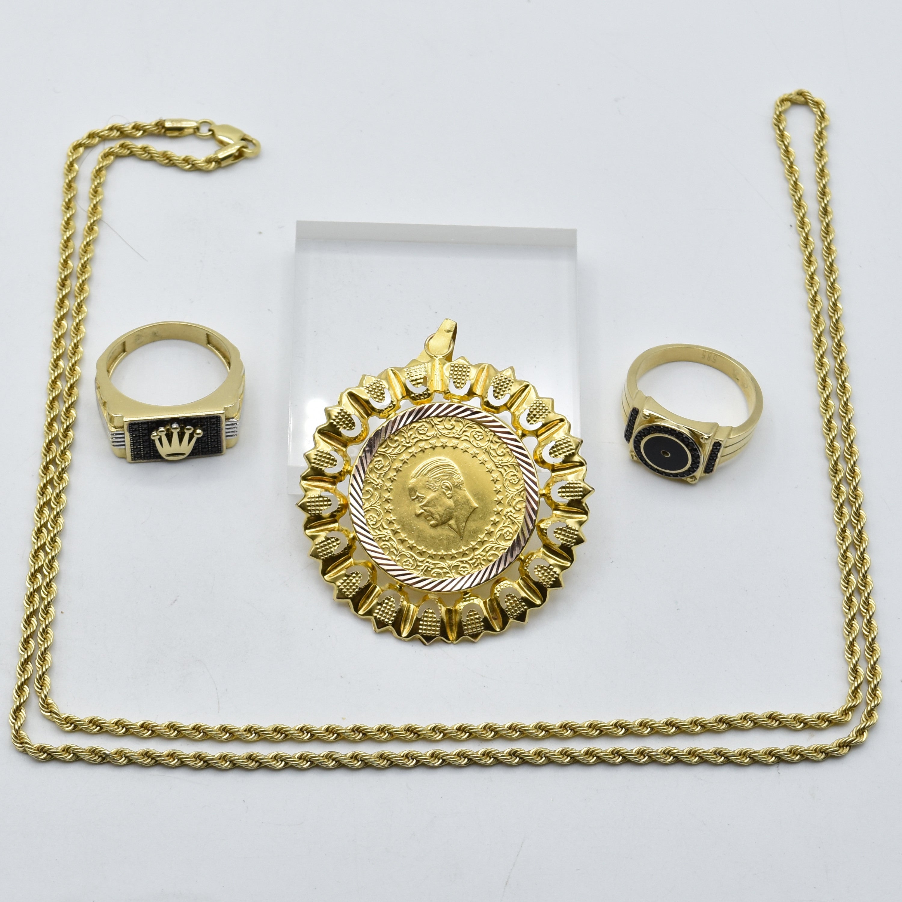 2 bagues, collier et pendentif en or jaune et blanc 14 ct serti d'1 pièce en or jaune 18 ct (pierres de couleur, morceau manque) - 31.7 g brut (Tailles: 63.5 & 64) (80 cm)