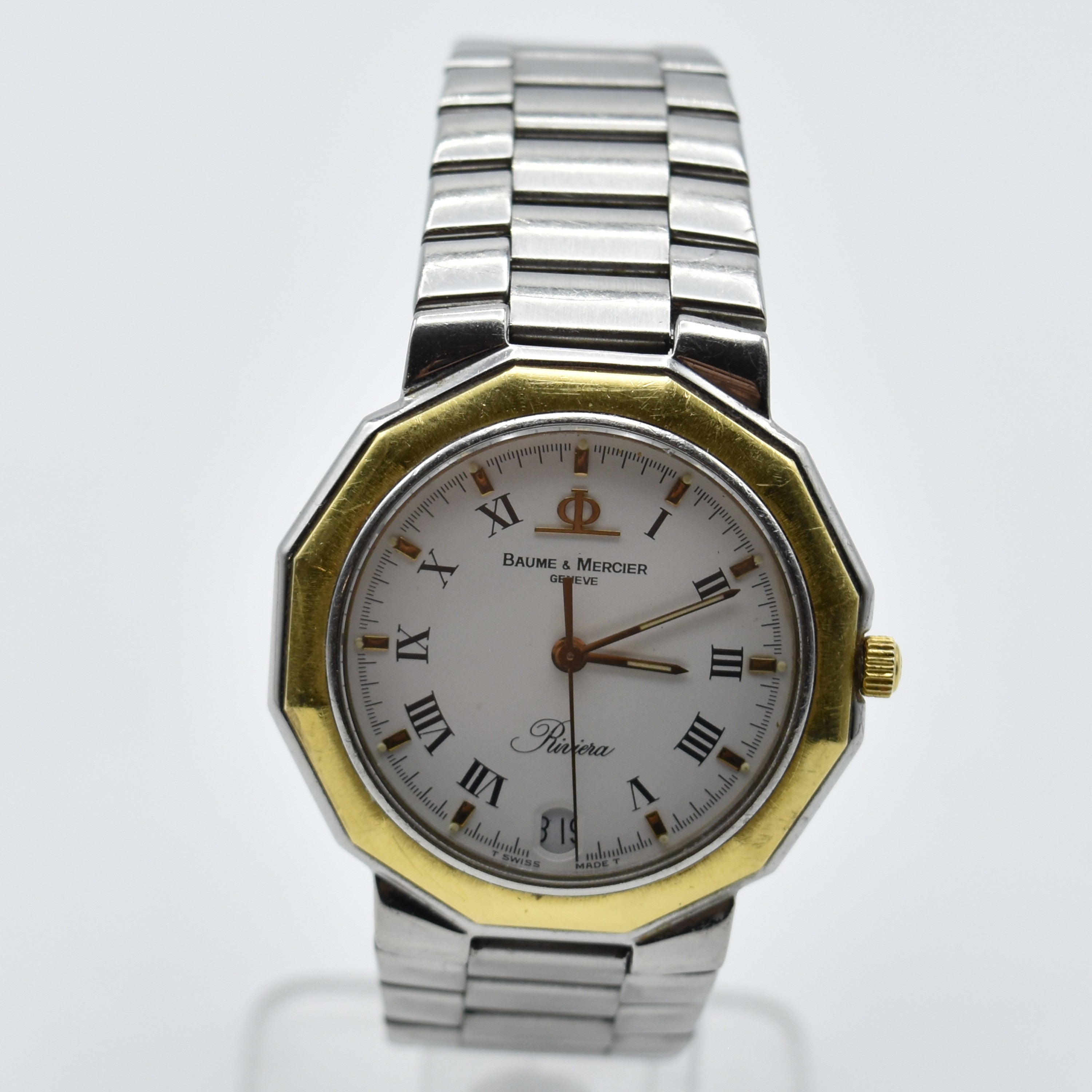 Bracelet-montre homme en acier et métal doré BAUME & MERCIER Riviera quartz (montre n° 1839637 5131.3, bracelet en acier avec boucle déployante, abîmé, griffée) (+/- 18 cm)