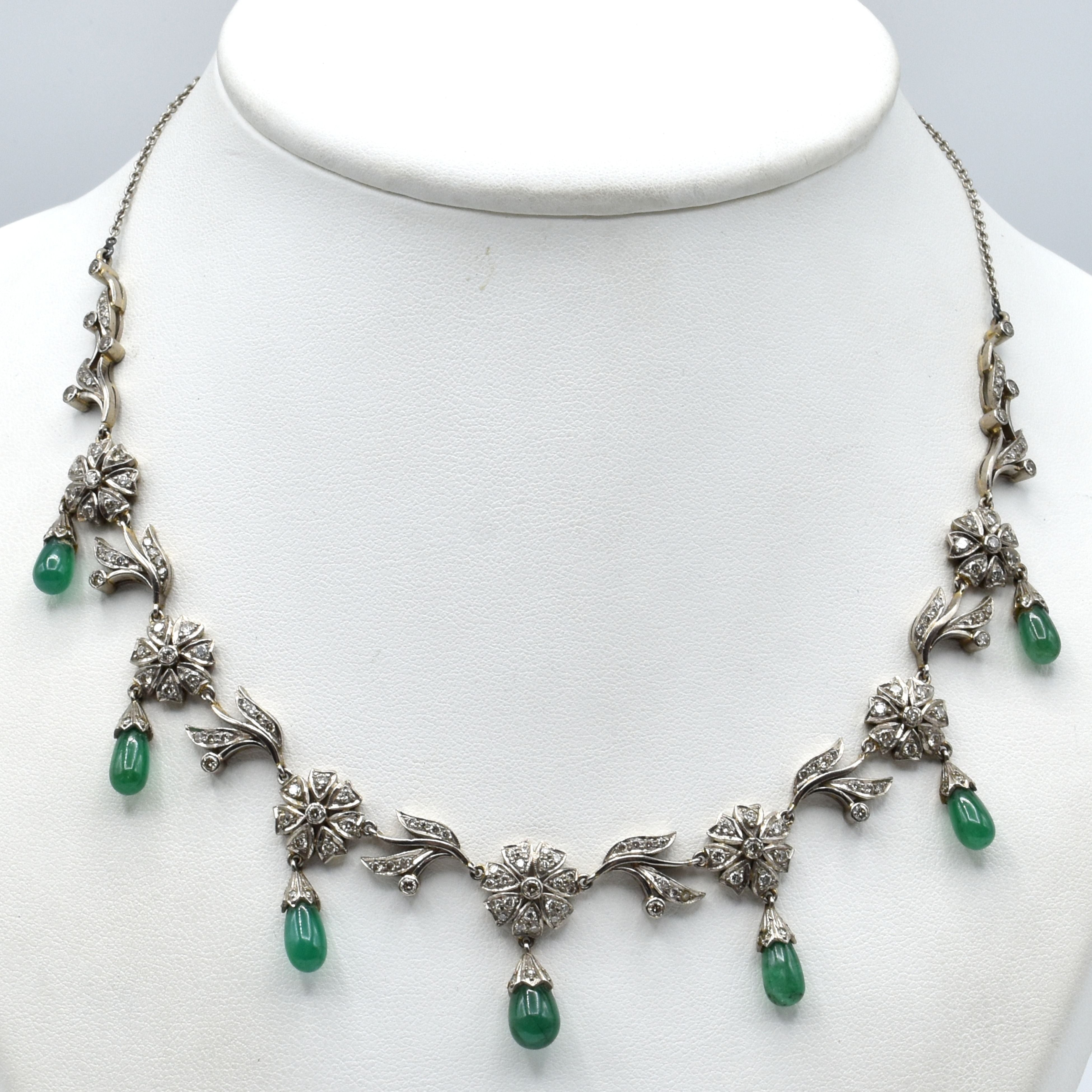 Collier en or blanc 18 ct serti de 152 brillants +/- 2.50 ct et émeraudes (1 pierre manque dans le fermoir) - 31 g brut (42 cm)